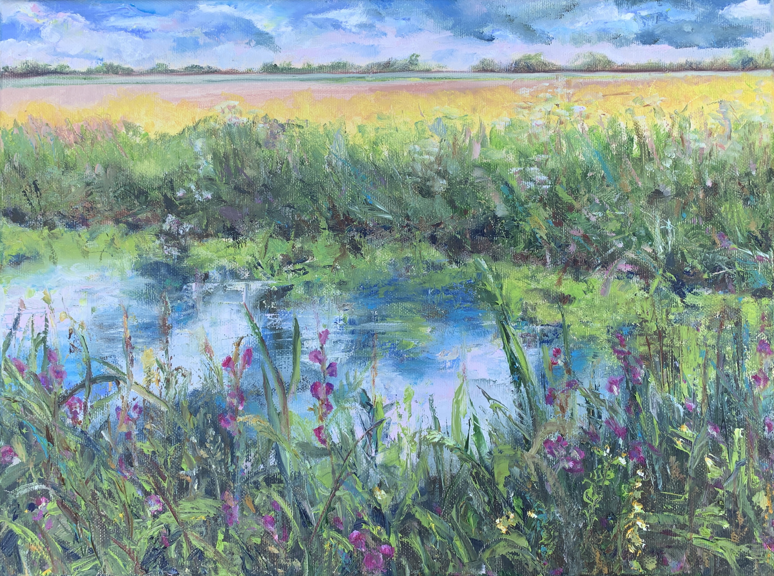 De natuur langs de Heidijk loopt uit. Prachtig, die weerspiegeling van de lucht in het water met de paarse kattenstaarten ervoor.
