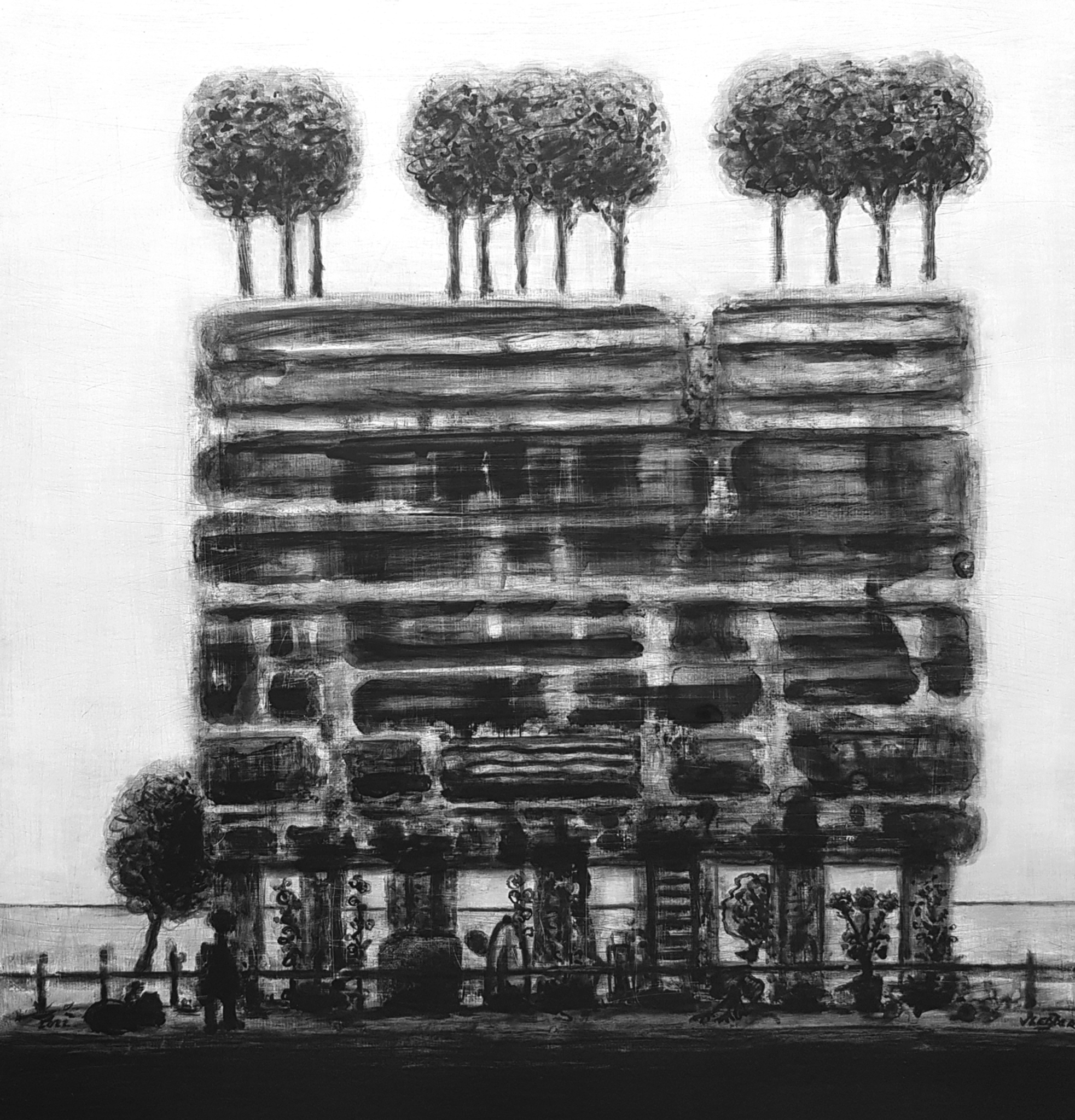 Groen Kunst Natuur Mens Bomen Acrylverf Stad Gebouwen Steden Beschaving Klimaatverandering Contemporaryart Zwartwitkunst Groenindestad Naturetakesitover