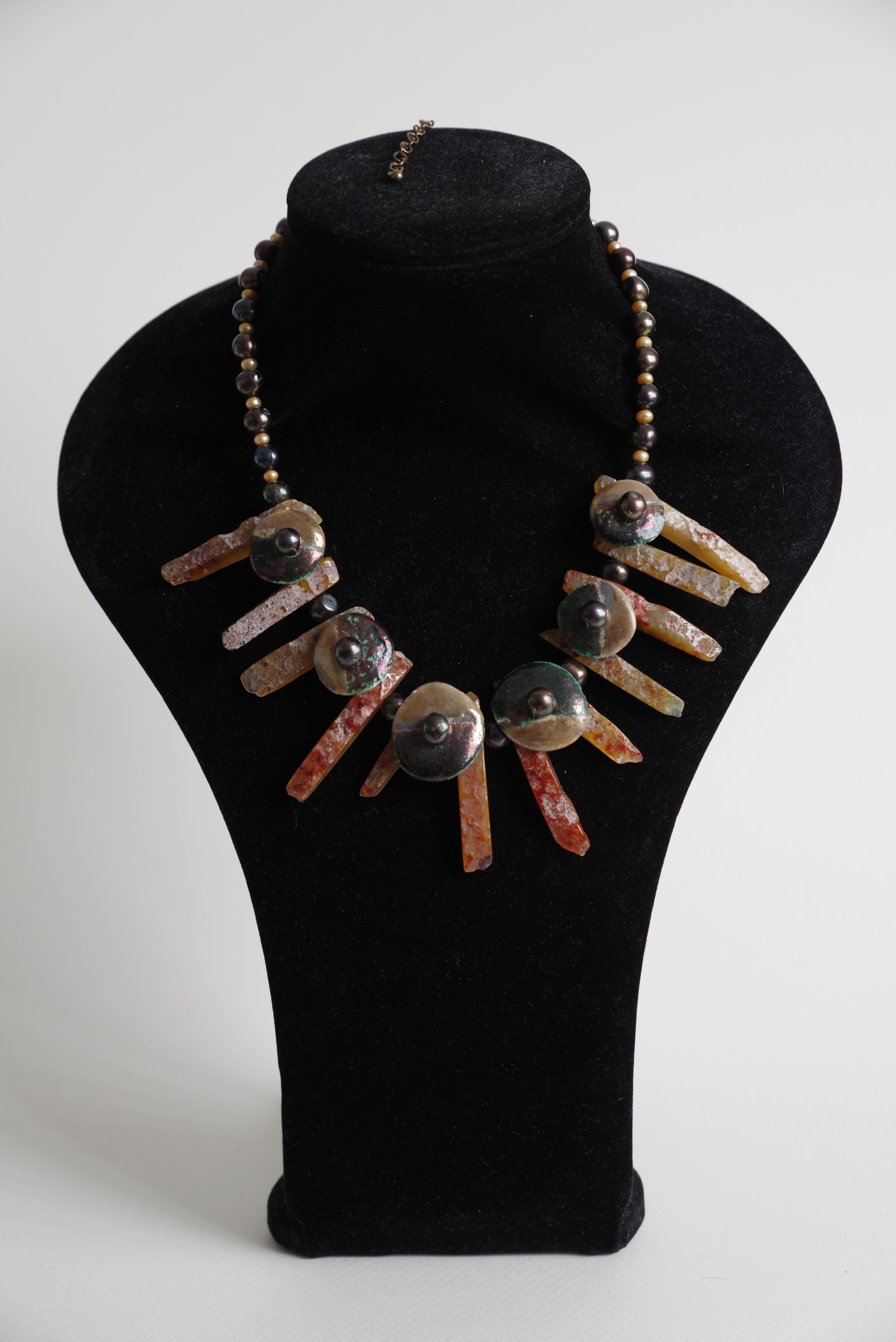 agaat (deels ruw, deels gepolijst), keramiek schijfjes, zoetwaterparels