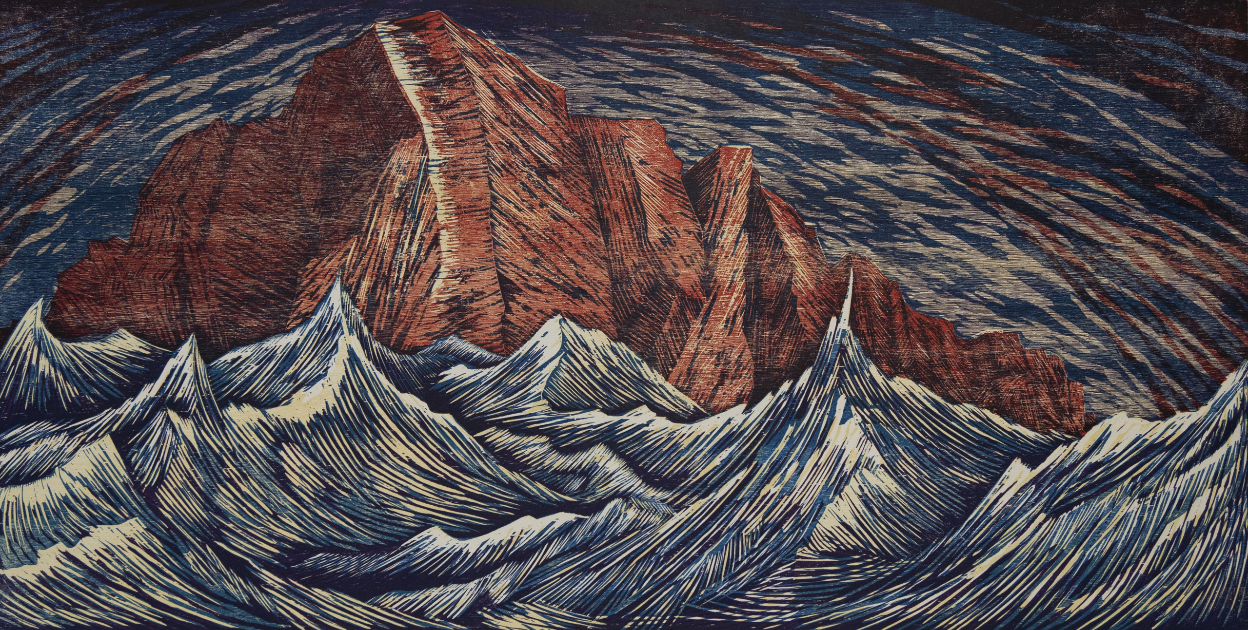 In meer kleurendruk houtsnedeprent leg ik de meedogenloze zee uit. Indifferent aan welke menselijke ingreep ook, ze veranderd haar koers in alle grilligheid. Brullend tegen bezwijkende kusten water staat nooit echt stil, tenslotte heeft water alle tijd van de wereld. Slijpt. beukt waar het zo uitkomt, onder invloed van andere natuurreuzen: maan wind zon en als maar uitdijende ruimte.