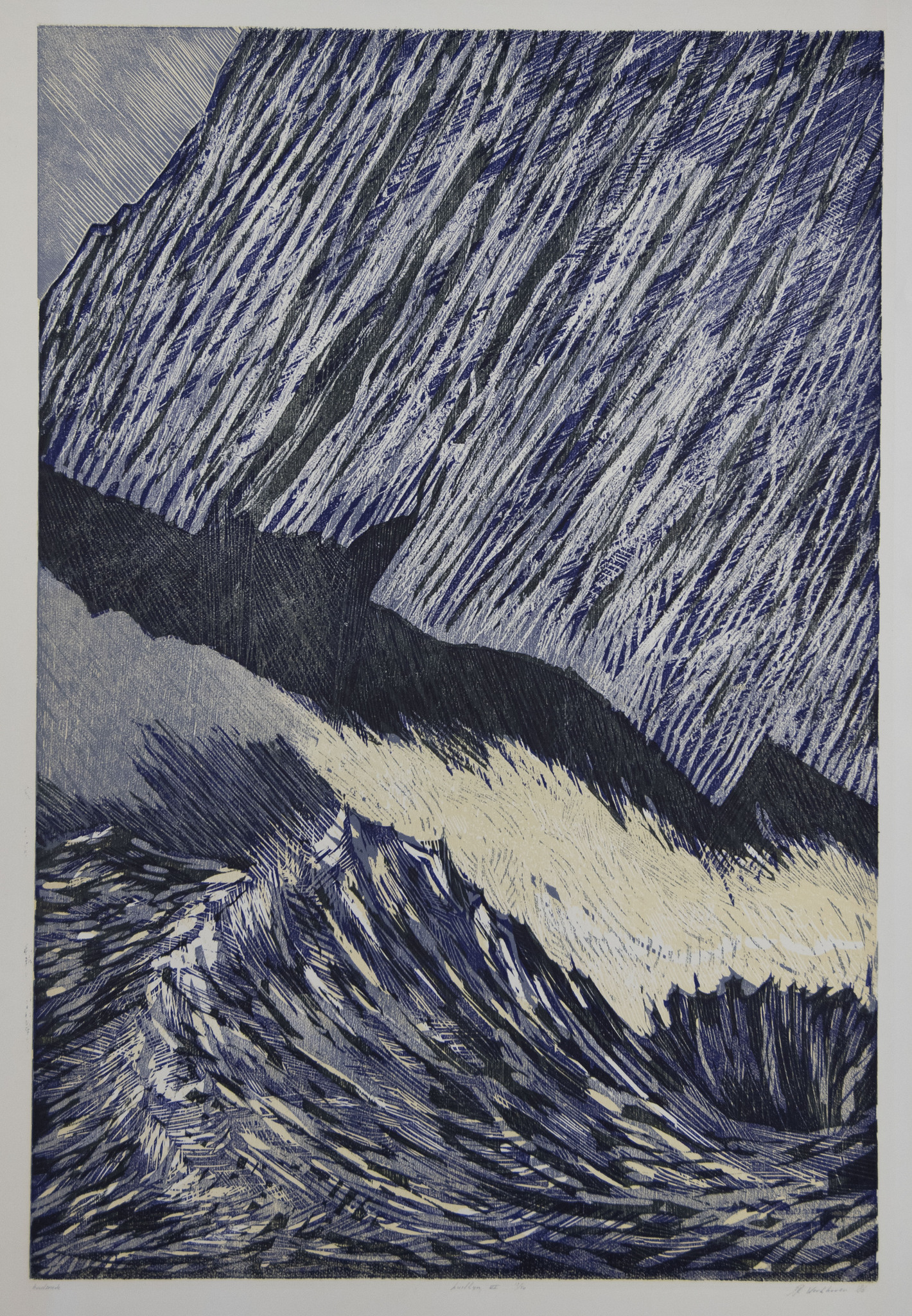 In meer kleurendruk houtsnedeprent leg ik de meedogenloze zee uit. Indifferent aan welke menselijke ingreep ook, ze veranderd haar koers in alle grilligheid. Brullend tegen bezwijkende kusten water staat nooit echt stil, tenslotte heeft water alle tijd van de wereld. Slijpt. beukt waar het zo uitkomt, onder invloed van andere natuurreuzen: maan wind zon en als maar uitdijende ruimte.