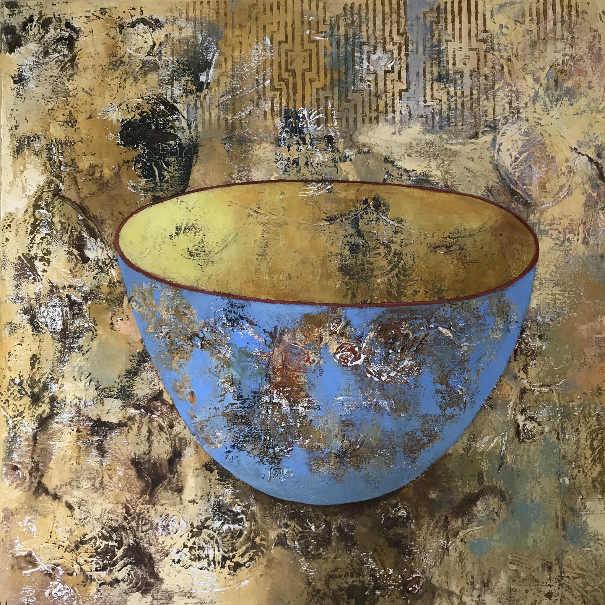 Met een mooie achtergrond met afdrukken wordt een sfeer opgebouwd waarin fragmenten van deze achtergond weer zichtbaar zijn in en op de schaal.