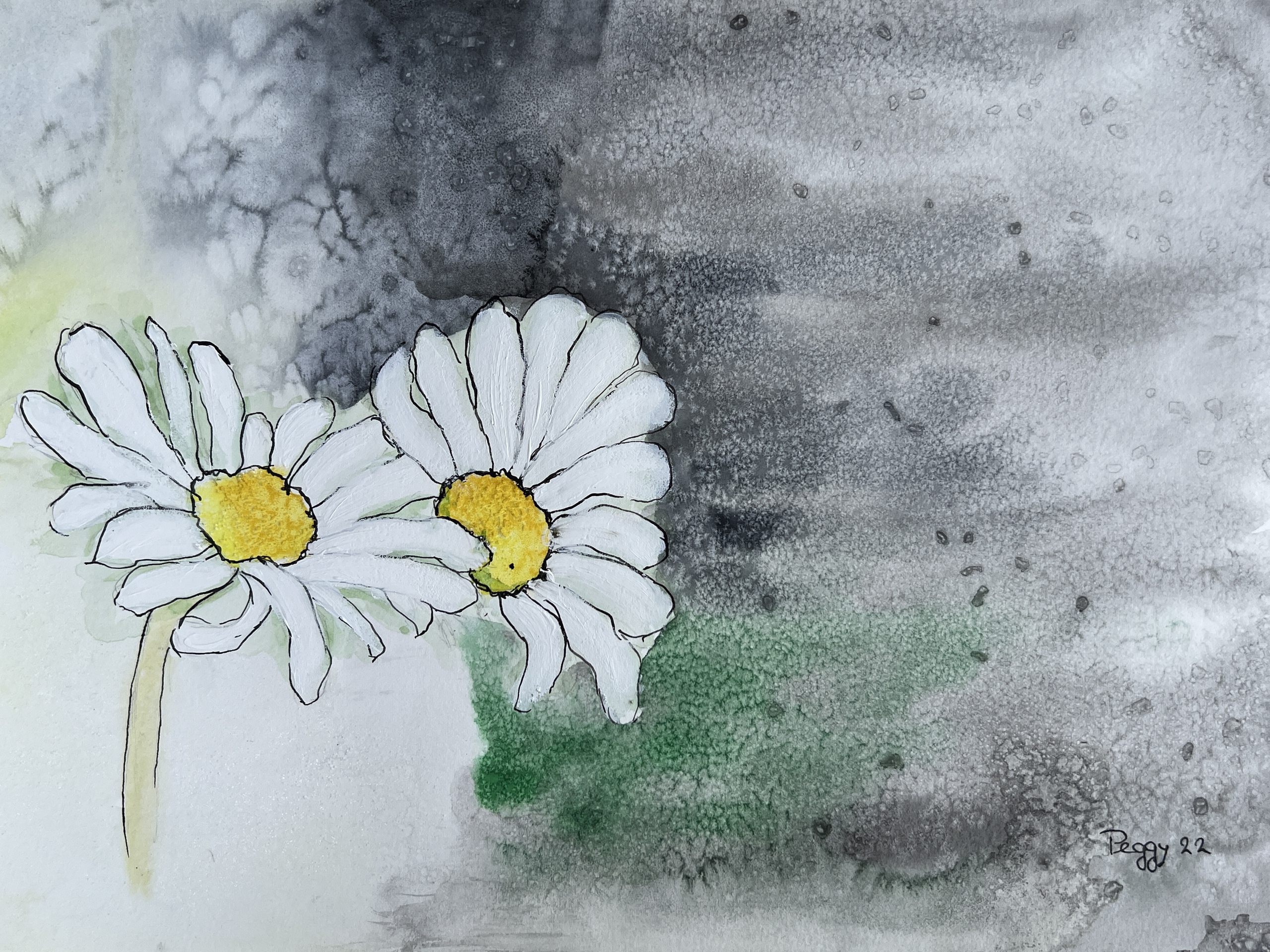 Aangezien ik elke dag uren in de natuur wandel, wilde ik dit op papier laten zien in aquarelverf en anderen laten genieten van de rust die het uitstraalt. De margrieten kleuren het landschap wit en groen, de kleur is zo rustgevend. Ik heb dit medium gebruikt omdat het zo mooi vloeit en weet niet welke kant het op gaat. Ook het gebruik van verschillende soorten zout geeft het een ander structuur aan de aquarel Hoogte 26. cm x bij 36 cm Je moet het nog inlijsten. Gesigneerd