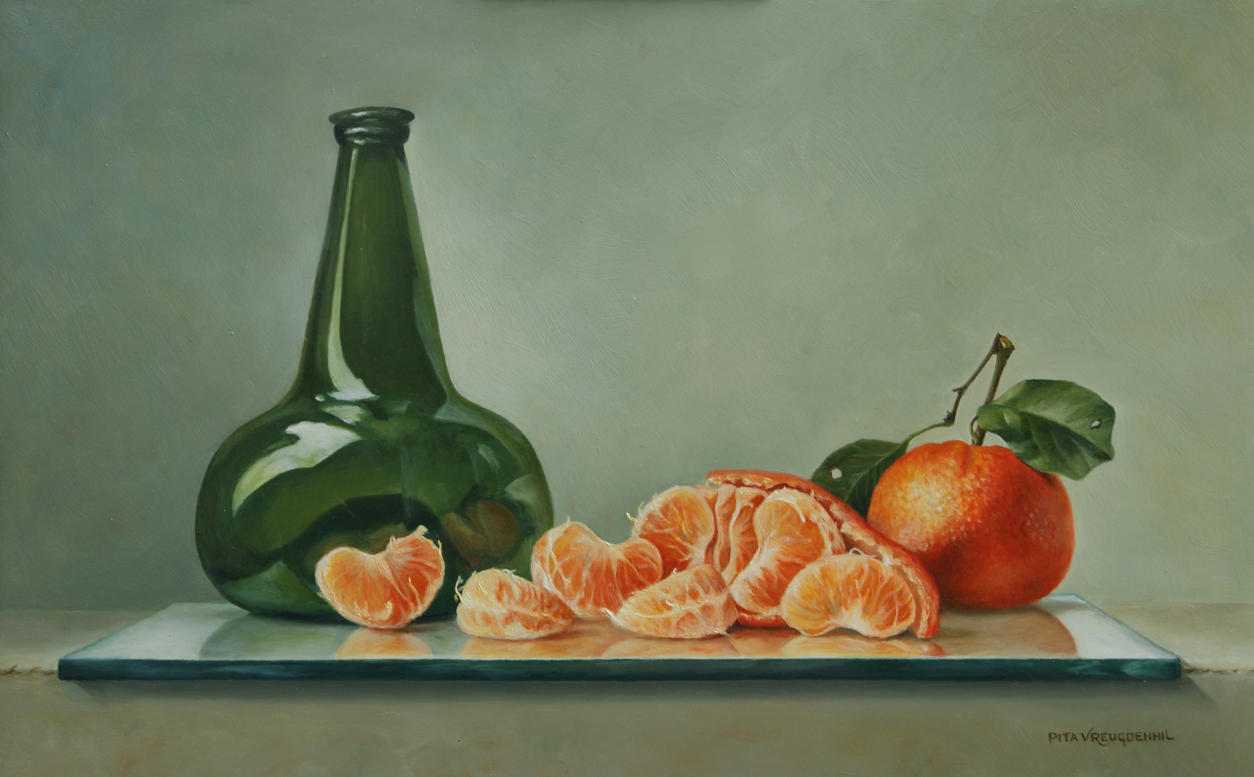 Verkocht. Stilleven met twee mandarijnen, waarvan één in parten en een oude fles Info: Kunstatelier Pita, Emst www.pitavreugdenhil.nl