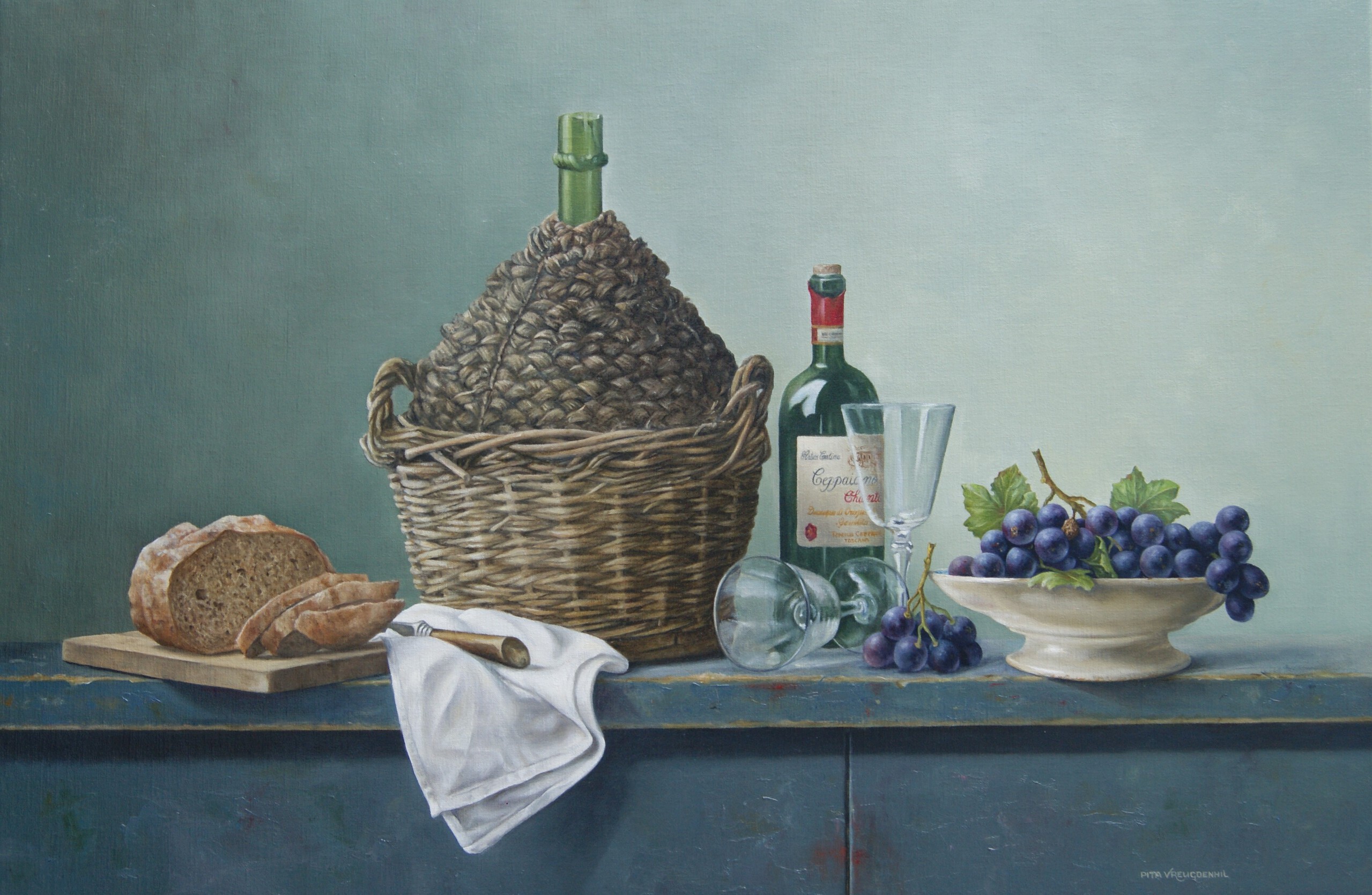 Verkocht. Stilleven met brood, oude italiaanse gistfles, wijn, glazen en blauwe druiven Info: Kunstatelier Pita, Emst www.pitavreugdenhil.nl