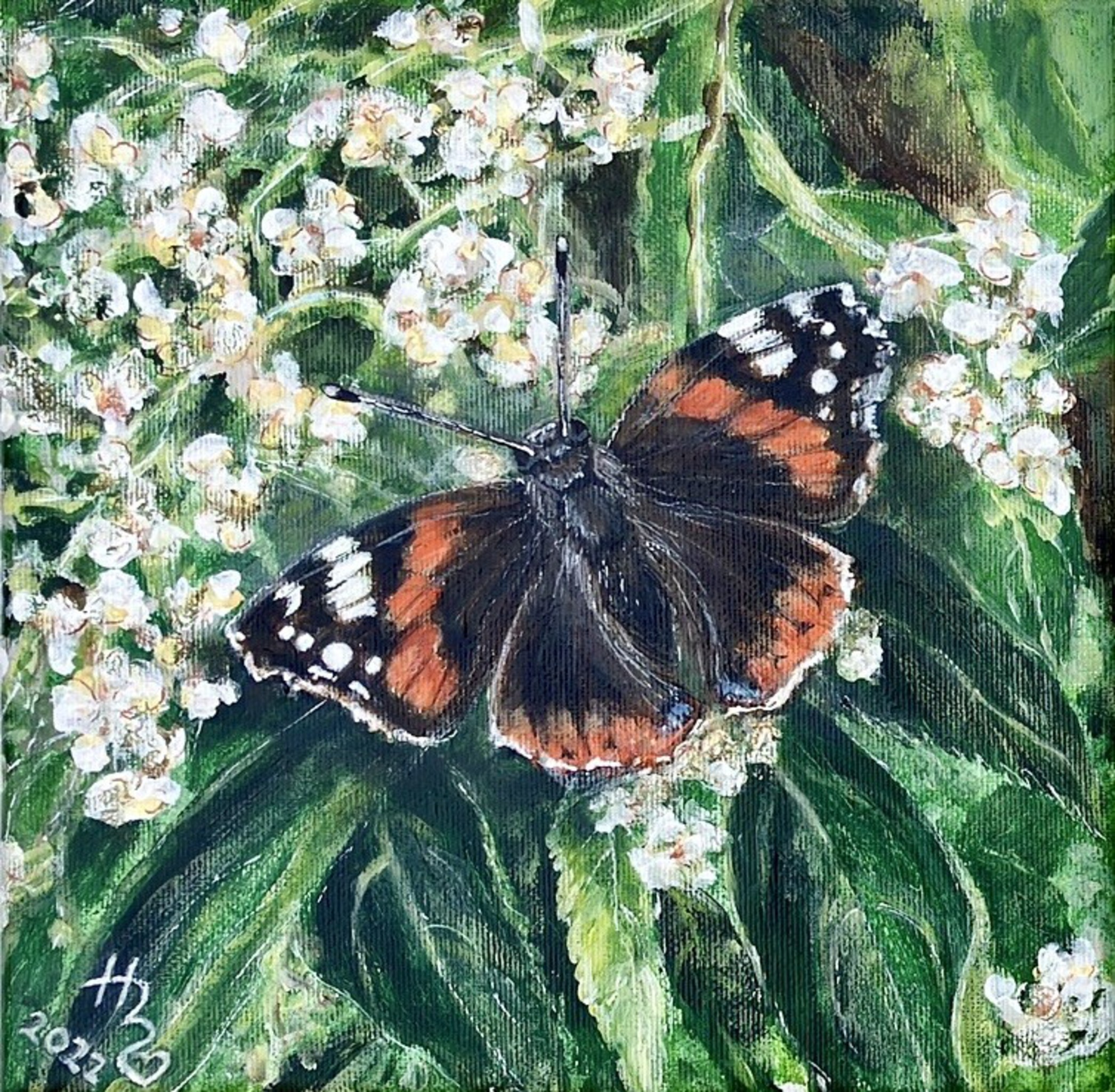 Gemaakt voor de tentoonstelling Insecten. Vlinders spreken altijd tot mijn verbeelding en ik geloof ook echt dat het boodschappers van boven zijn. Als ik er eentje zie denk ik aan een overleden dierbare. Het blijft altijd een bijzondere ontmoeting, die ik soms probeer vast te leggen met camera en nu ook in een schilderijtje.