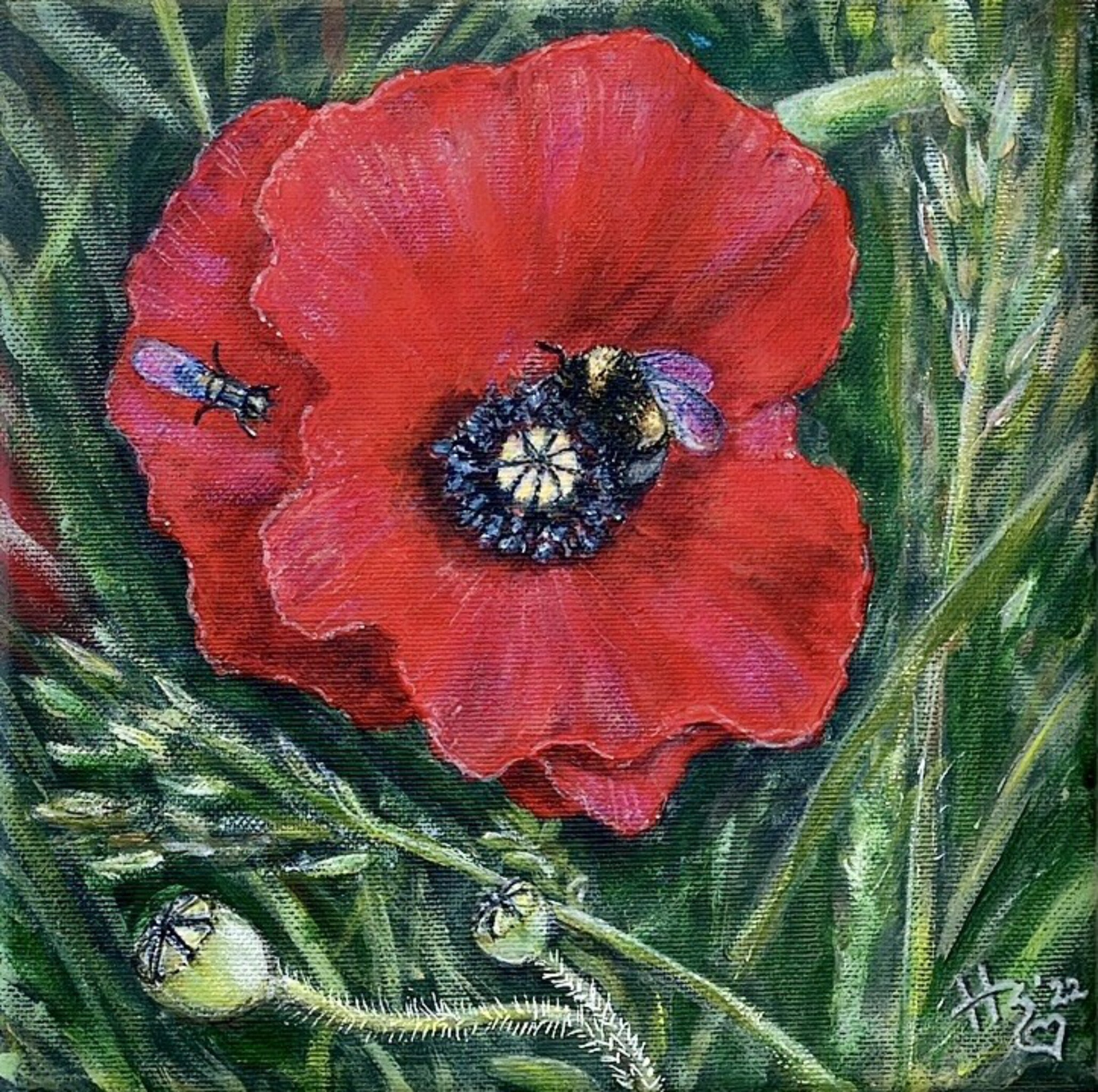 Gemaakt voor de tentoonstelling Insecten. Mijn favoriete bloemen zijn klaprozen en ik heb er heel veel foto's van gemaakt.. en als er dan ook nog een bij bij komt is het helemaal een prachtig plaatje om vast te leggen in een schilderijtje.