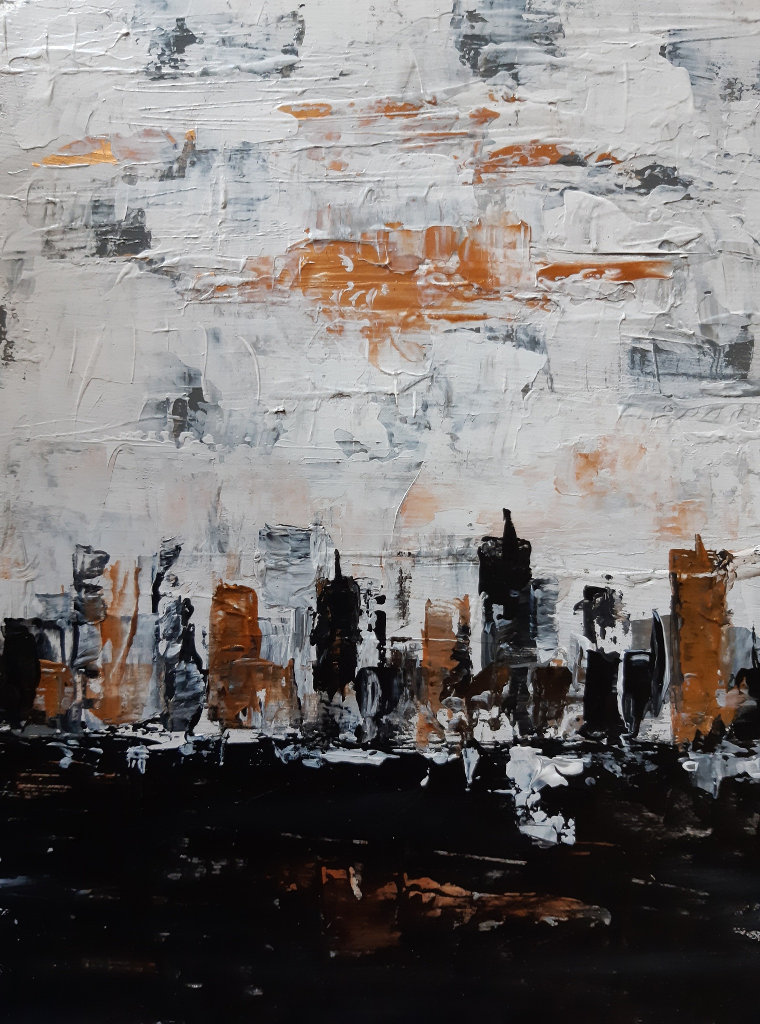 Kleine "City skyline" acrylschilderijtjes geschilderd op mdf. Ook leuk om meerdere te combineren. Gebruikte kleuren zijn wit, zwart en goudverf. De goudverf is in het echt niet zo geel maar meer licht goud. Aan de achterkant voorzien van een tandhaak. In diverse maten.