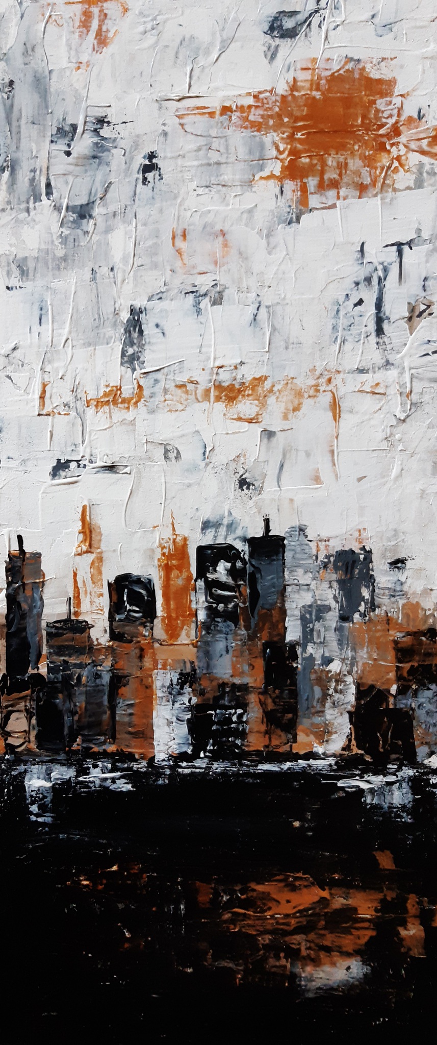Kleine "City skyline" acrylschilderijtjes geschilderd op mdf. Ook leuk om meerdere te combineren. Gebruikte kleuren zijn wit, zwart en goudverf. De goudverf is in het echt niet zo geel maar meer licht goud. Aan de achterkant voorzien van een tandhaak. In diverse maten.