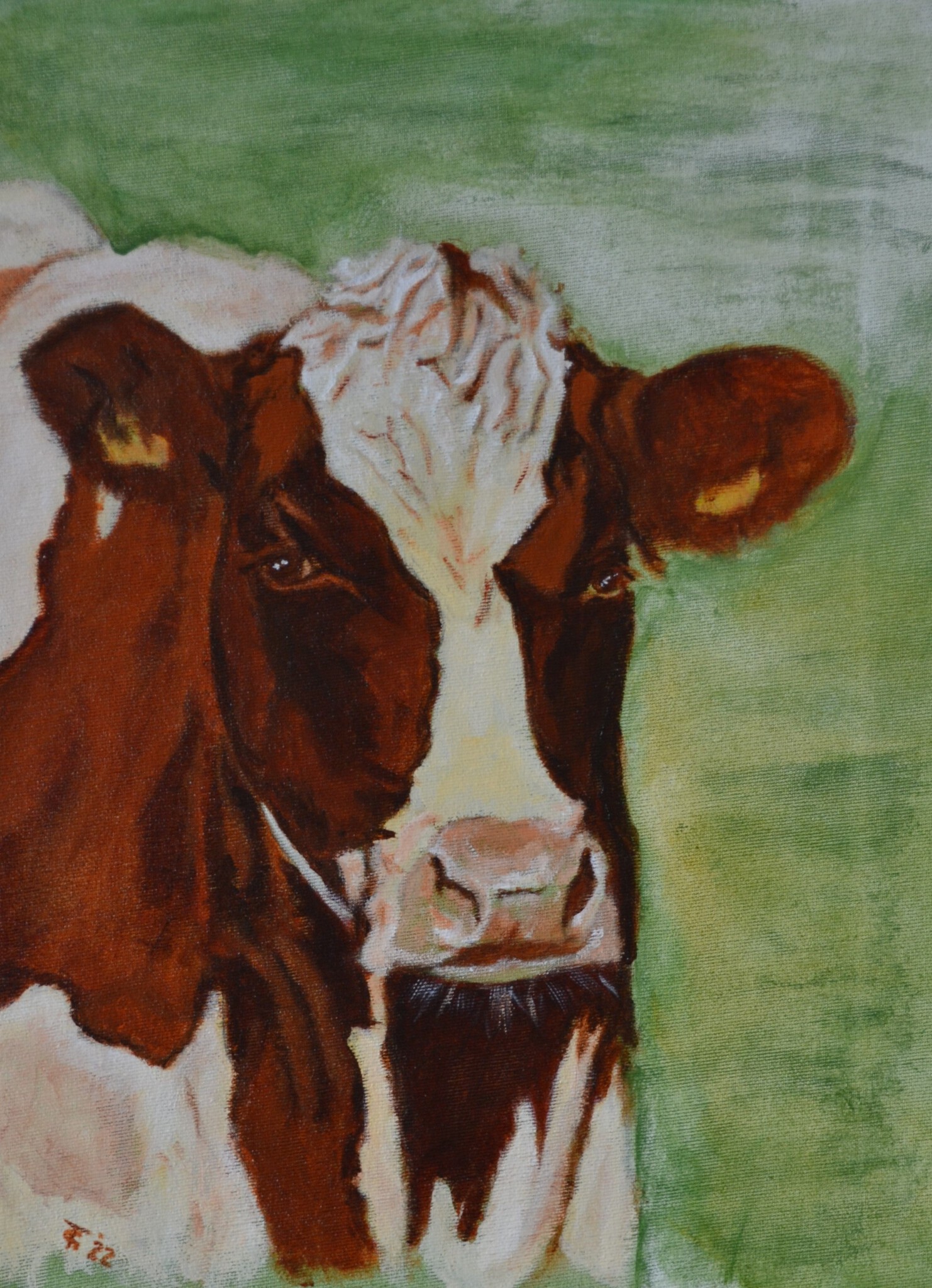 Keek mij tijdens een wandeling vanuit de wei nieuwsgierig aan. Wat een mooie kop. Vast gelegd op foto en na 2 jaar eindelijk geschilderd.