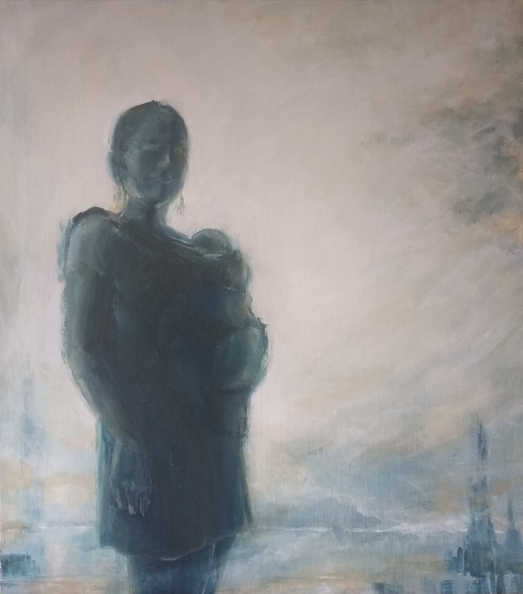 Moeder met pasgeboren kind, tegen de achtergrond van een onbekende toekomst. Ik heb de oerkracht van een moeder willen visualiseren om haar kind te willen beschermen.