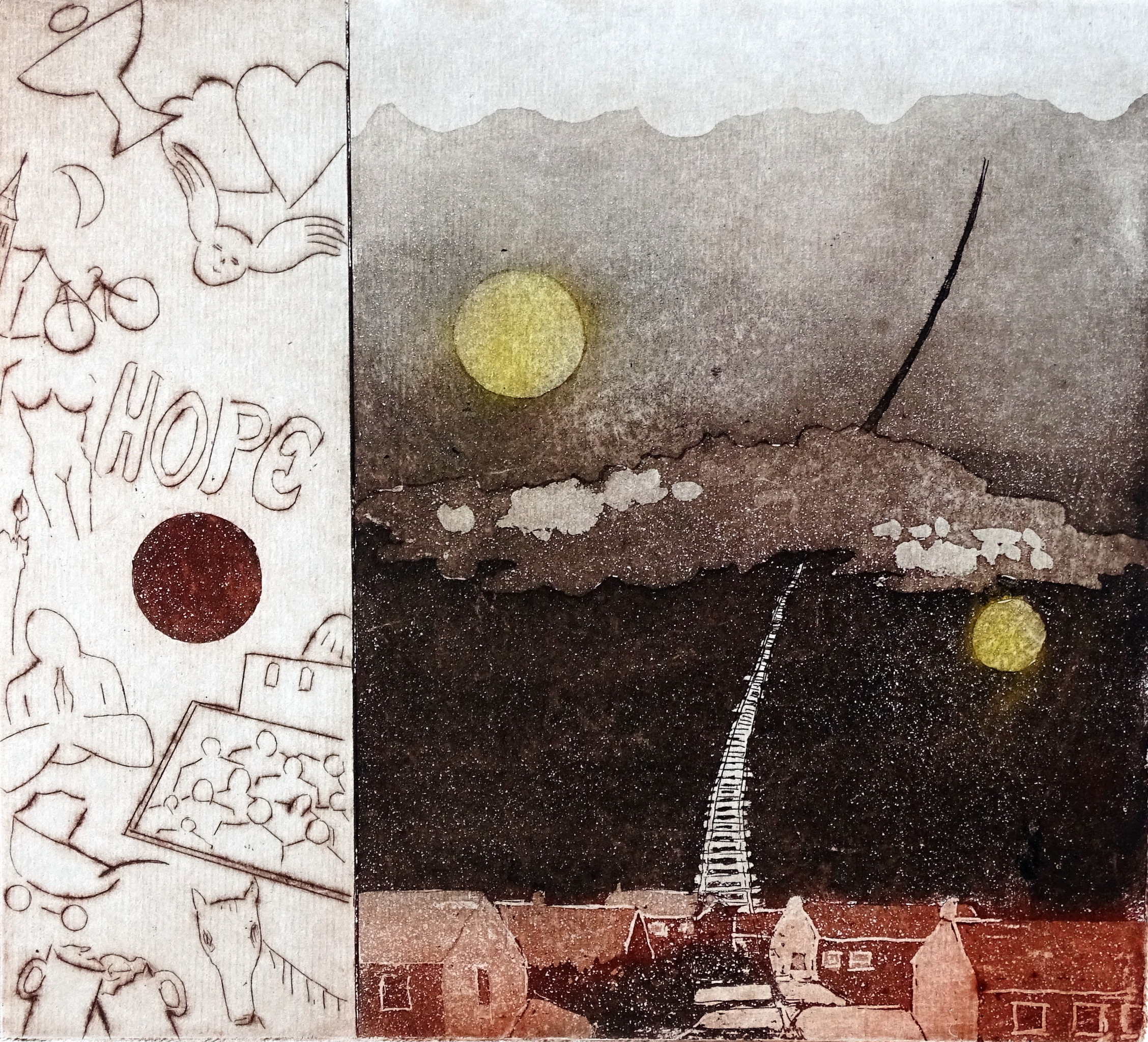 de weg naar het hiernamaals is ongewis. wat stellen we ons er van voor ? enkele voorstellingen uitgebeeld met droge naald . de waeg nao baove kintj nemes. waat de miens zich dao van veur kan sjtelle, vindt gae lings van de ets mit de druuege naoldjtechniek aangegaeve.