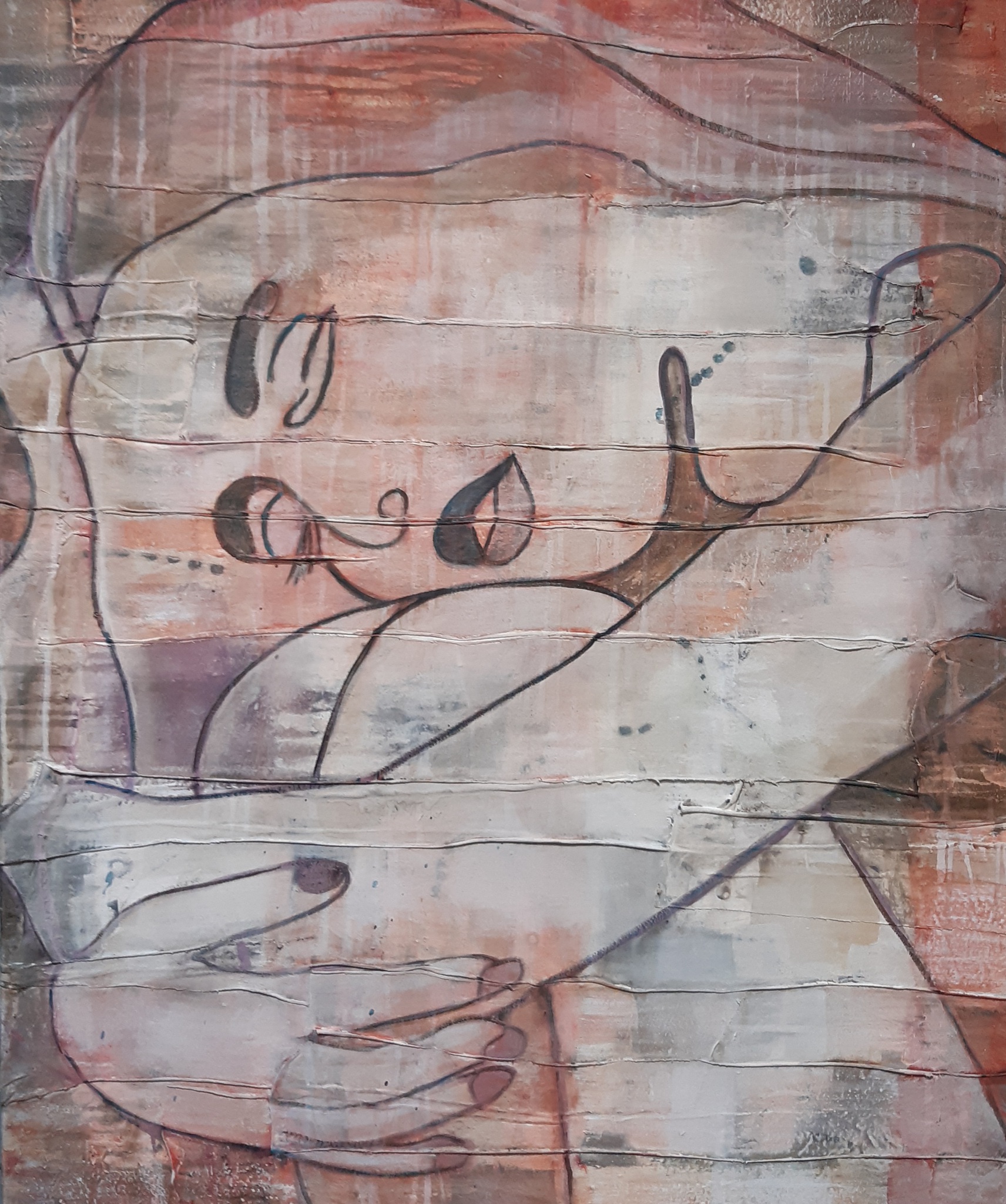 Dit schilderij was jaren inwording,nu laat ik haar los. Opgebouwd uit lappen stof en de stoffen zijn aangebracht met speciale gel om niet los te laten.