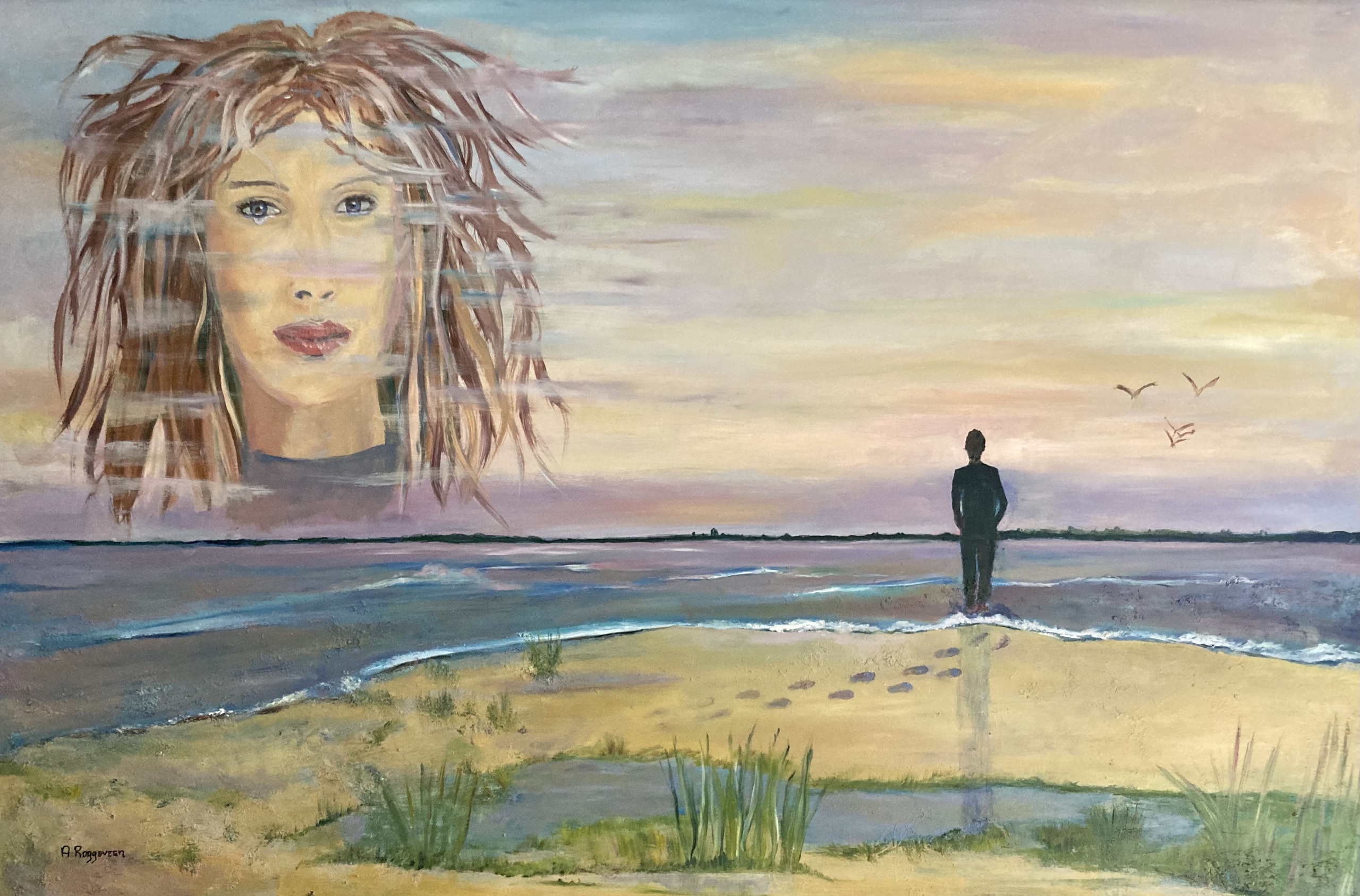 De Mantelzorger die altijd aanwezig is op de achtergrond, de echtgenoot die langzaam aan het verdwijnen is. "dementie" De lijst zit erbij in de kleur die ook in t schilderij zit, paarsblauw