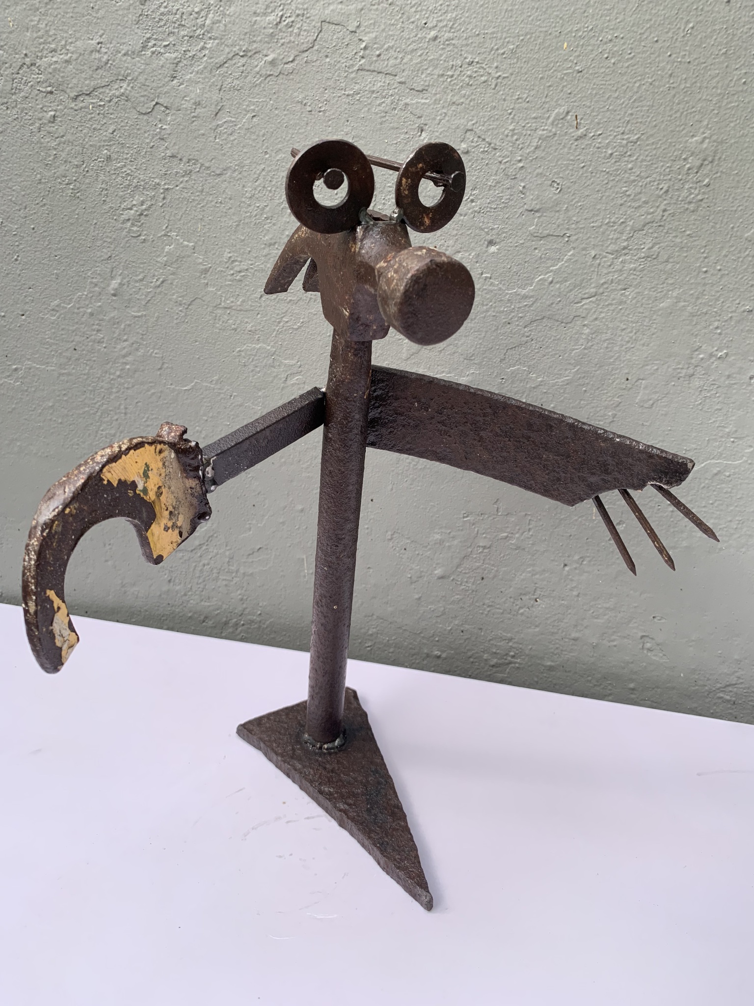Sommige mensen kunnen bij tijd en wijle gefocust zijn op mogelijke belemmeringen die zij op hun pad tegen komen.en daar een onevenredige zwaarte aan toekennen. Als dit het geval is kun je een blik op deze krachtige sculptuur werpen en de zwaarte van de mogelijke belemmering in zijn/haar 'klauwen' leggen en daarmee een vrijere doorgang op jouw pad creëren... Gemaakt voor iemand als geschenk van gevonden metaaldelen