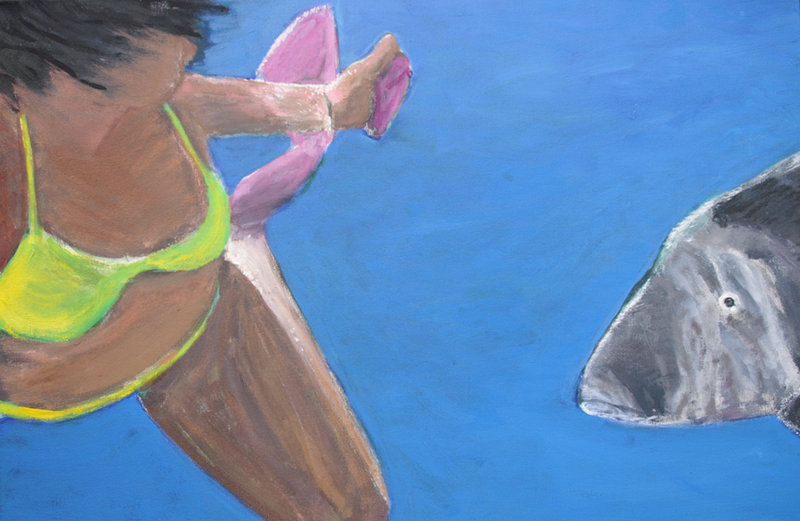 afbeelding in kleur; zwemster verrast door zeebaars