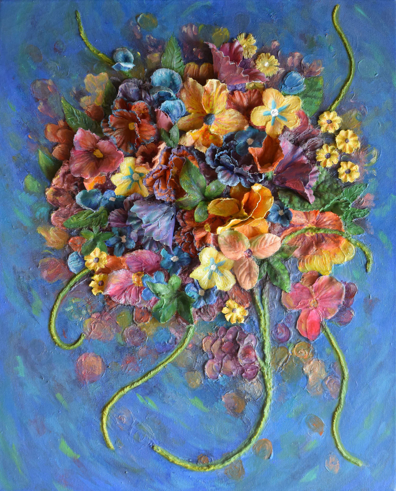 Fleurig boeket bloemen dat letterlijk het schilderij uitkomt. Het boeket is gemaakt van stof, gehard met paverpol en uiteindelijk beschilder met acrylverf.