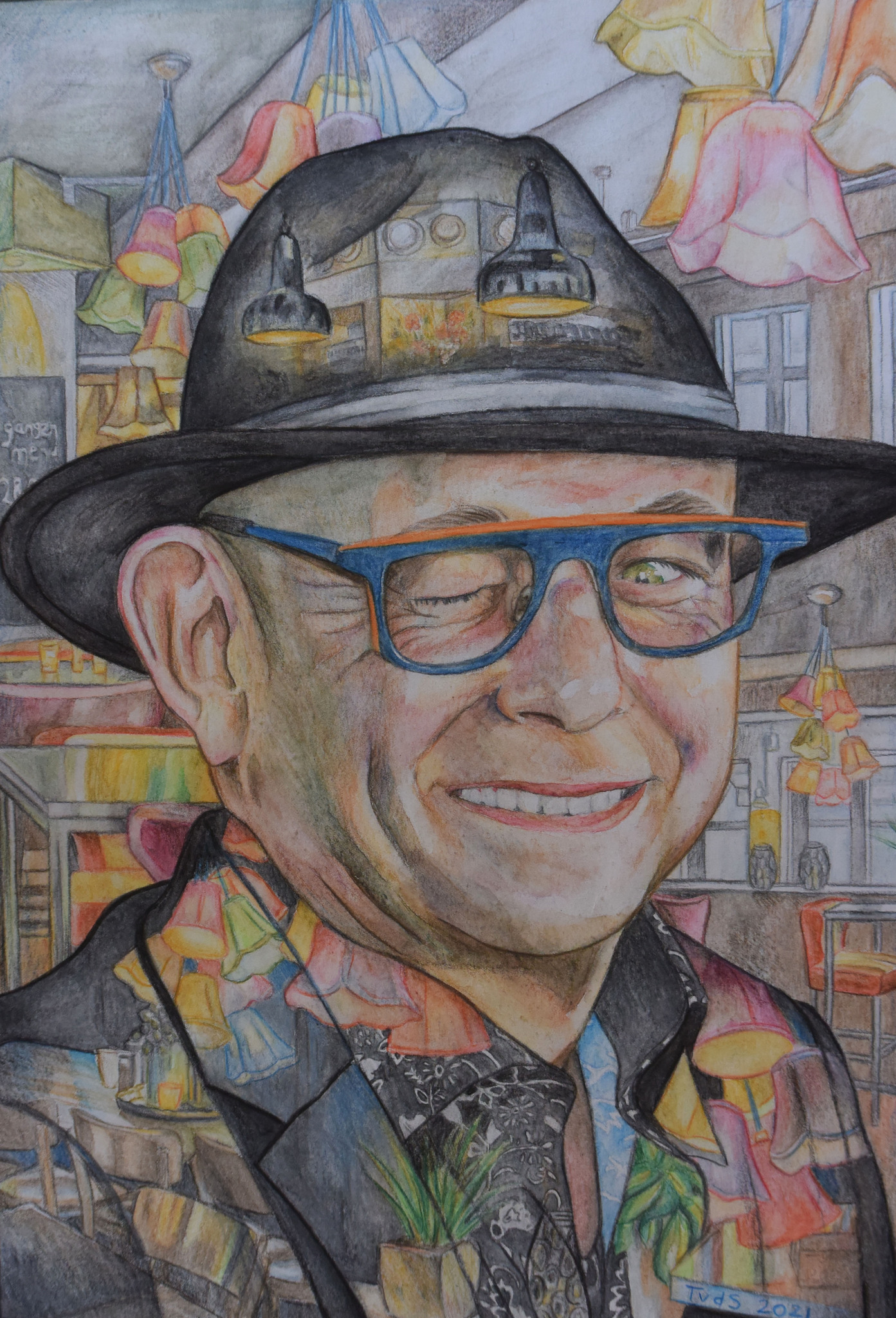 Dit is een verhalend portret van een man in zijn eigen cafe. Het is getekend met aquarel potloden en daarna geaquarelleerd.