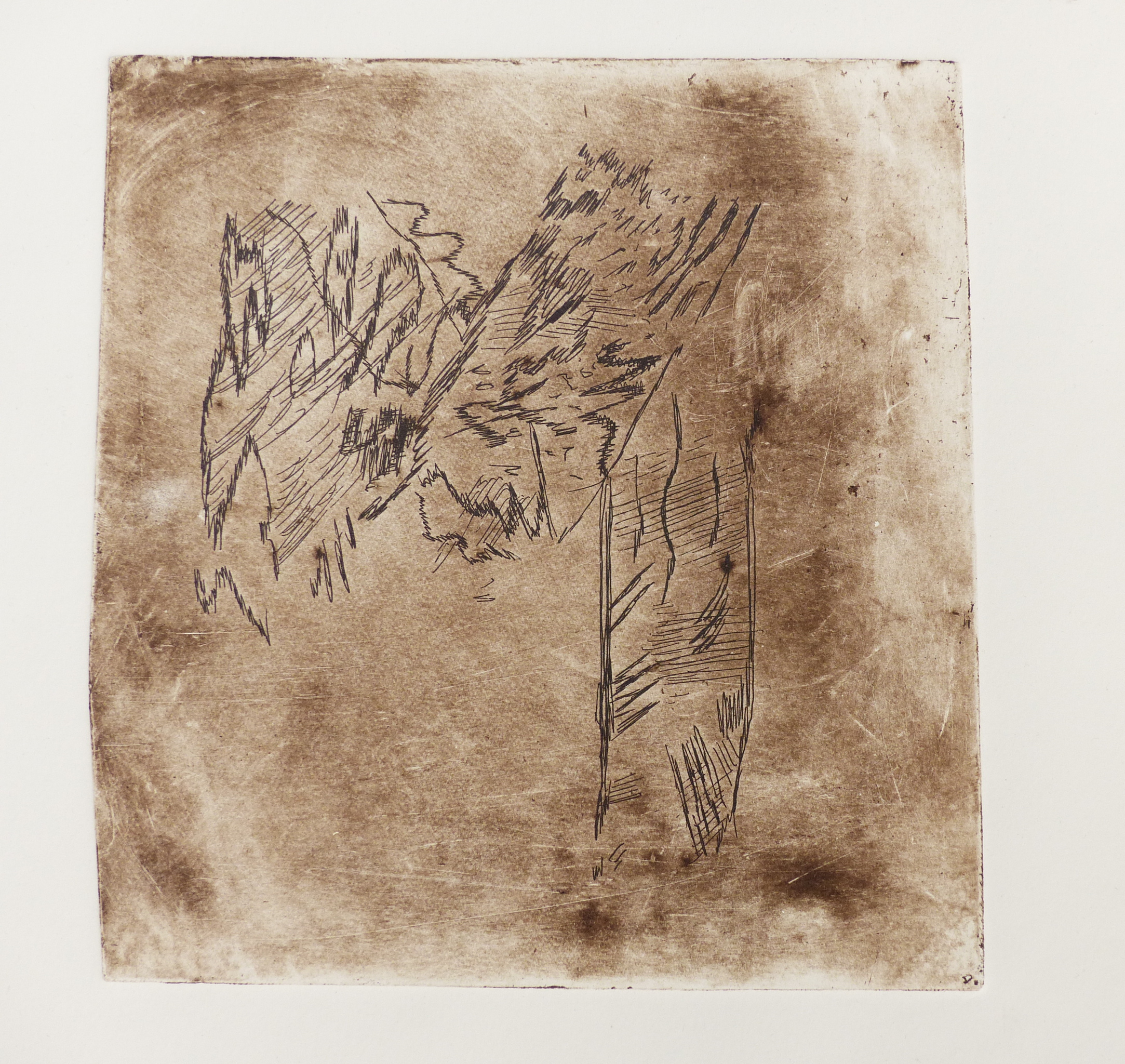 "Eén keer eerder / deed ik zo'n stijle klim / en nu weer / met toenemende last / van gammele gewrichten" (ets, beeld 15x15.5 cm, uitgave van III)
