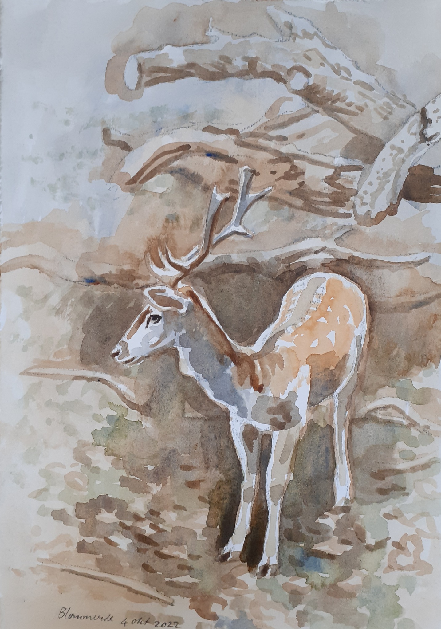 Aquarel van een hert in Koekamp, Den Haag