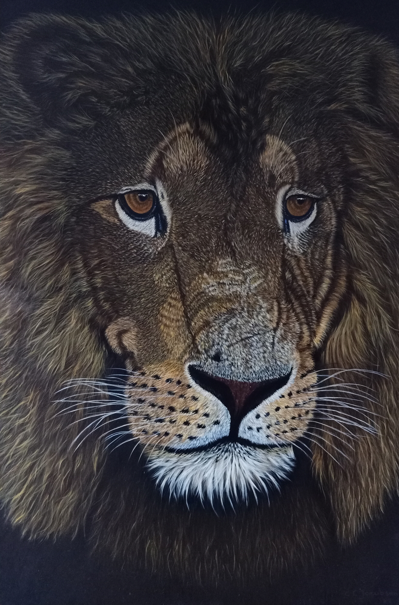 Droevige kijkende leeuw, Bijna zwarte achtergrond. Gloss vernis. 115x75 cm In donkerbruine baklijst