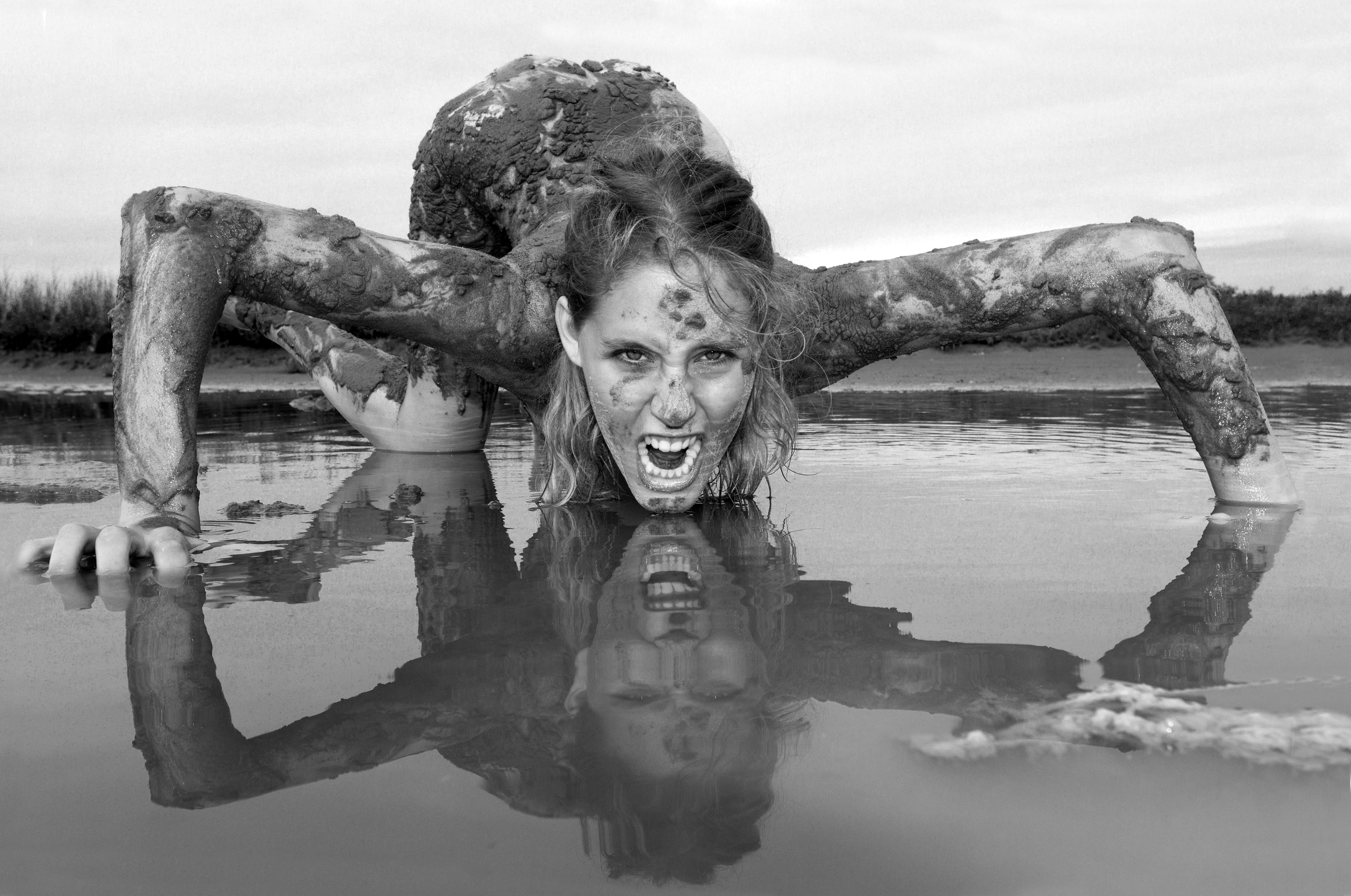 Foto van een met zand en modder bedekt naakt in water van een kreek in de Kwade Hoek Goeree Overflakkee. Door de reflectie in het water lijkt het naakt 8 "poten" te hebben. Duidelijk is te zien dat het model naakt is, maar het naakt is impliciet, er zijn geen borsten of geslachtskenmerken te zien. De foto straalt vrolijkheid uit, de lol spat er van af. De houding en de expressie van het model benadrukken de sfeer van de foto. De foto ontstond spontaan, bedoeling was om het naakt te abstraheren door het in te smeren met zand en modder. Bij het poseren ontstond het idee om een luchtige foto te maken. Het zand en de modder vervreemden het beeld. De bedoeling van de foto is dat de vrolijkheid overslaat op de kijker. Hij moet in ieder geval een glimlach op het gezicht van de kijker toveren. De foto kan overal gebruikt worden, liefst in een lichte, heldere omgeving en mag gerust erg groot aan de wand gehangen worden. Ik heb bewust voor een zwart witte benadering gekozen, omdat dat de kracht van de foto vergroot. De foto is oorspronkelijk in kleur, de kleuren zijn in Photoshop omgezet naar zwartwit. Als je van natuur, in combinatie met een naakt figuur houdt, is dit een foto voor jou. Mijn specialisme is overigens het fotograferen van naakt in de natuur, waarbij ik vooral zwartwit gebruik om de uitstraling krachtiger te maken. Ik werk het liefst in herkenbare, Nederlandse natuur, dat de kijker/liefhebber zich kan identificeren met de foto.
