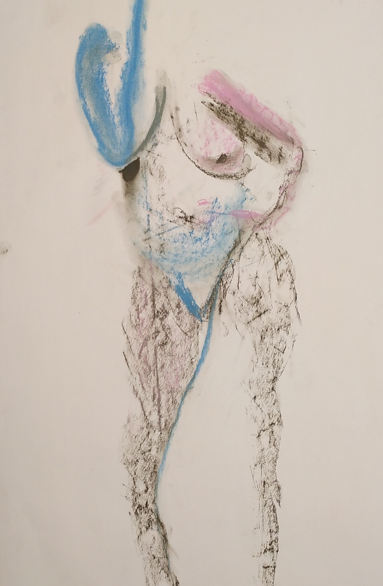 Model getekend op ruw verfbord vol verfspatten. Softpastel.