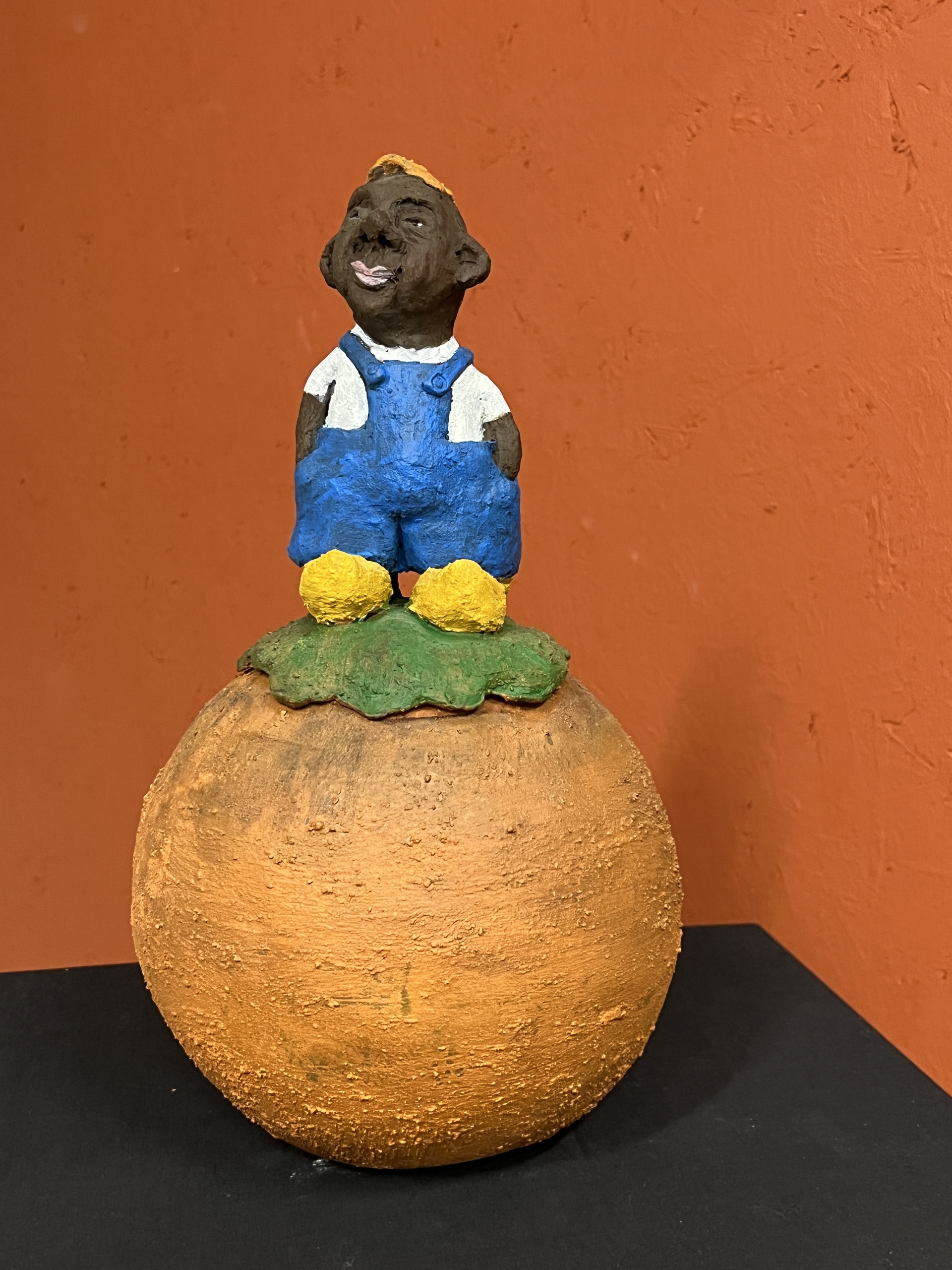 Boerje op een bol kijkend over zijn akker. Keramiek met acrylverf. Hoogte 34 cm x Breedte 20 cm x Diepte 20 cm Gewicht: 3,3 kg