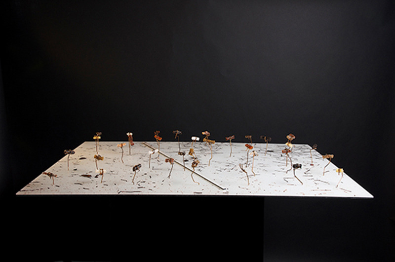 Unearthed2 is in serie met Unearthed1, een ode aan de aarde. Boven een foto van beton zweven samples van aarde uit alle windstreken.