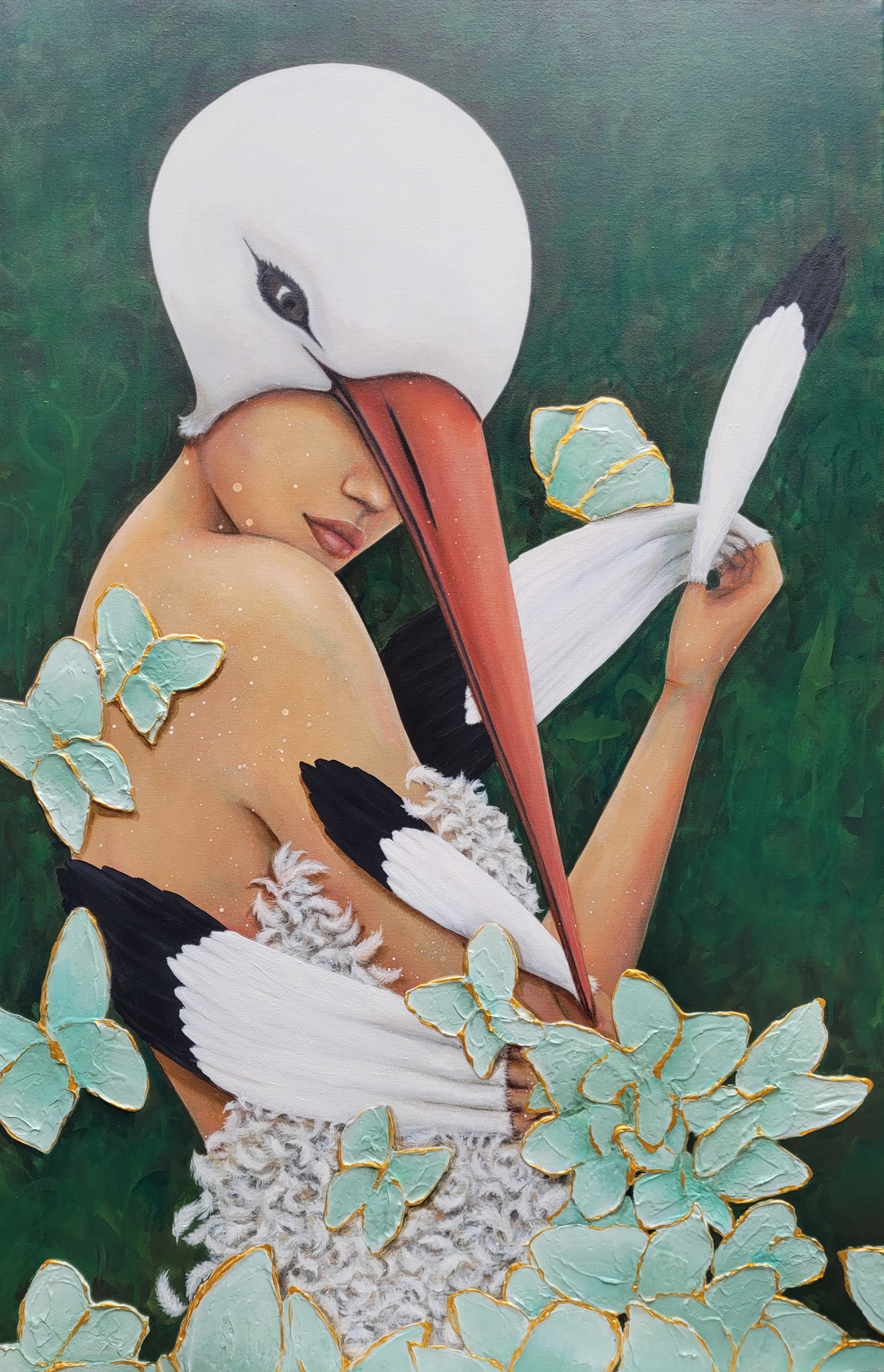 Sold Portret van een ooievaarsvrouw tegen een donkergroen gemèleerde achtergond. De zachtgroene vlinders hebben een gouden randje en liggen dikker op het doek doordat ze gemaakt zijn met modelleerpasta . Afm. 90 x 60 cm.
