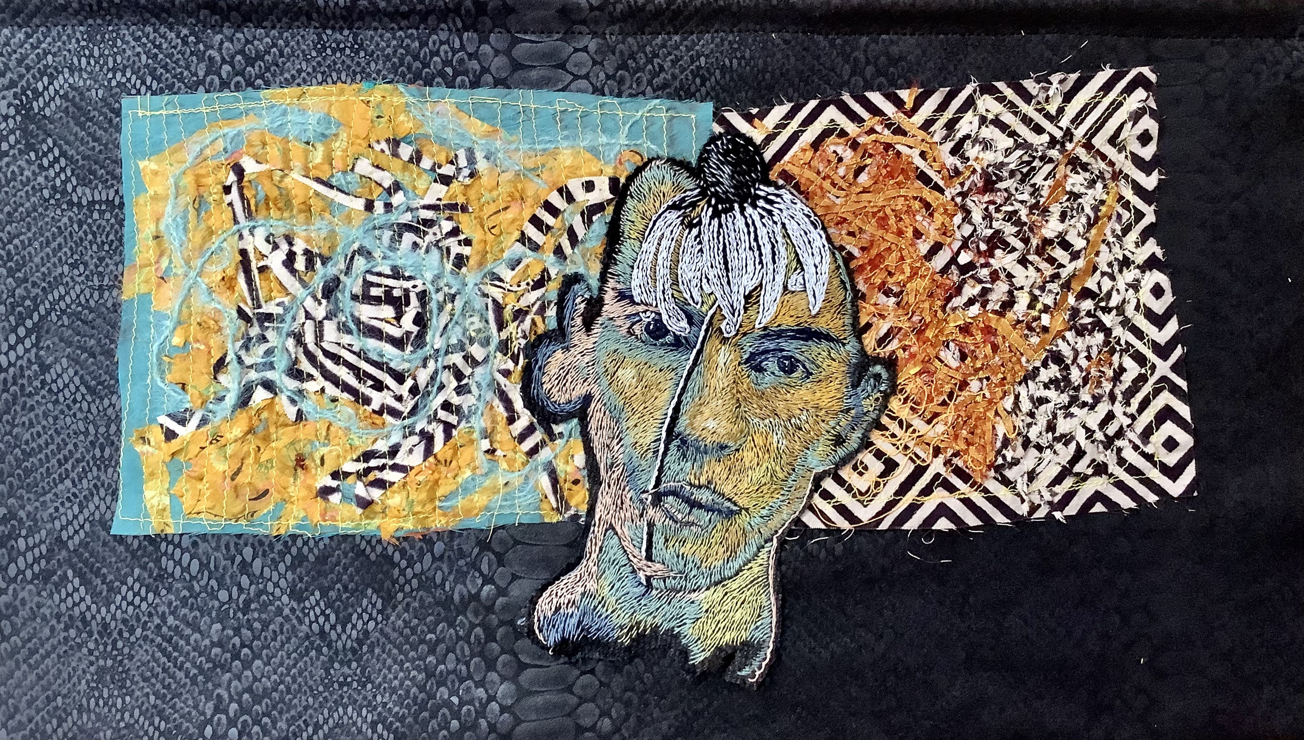 Handgeborduurd portret, machinaal gestikte achtergrond, mohair, zijde, katoen, polyester
