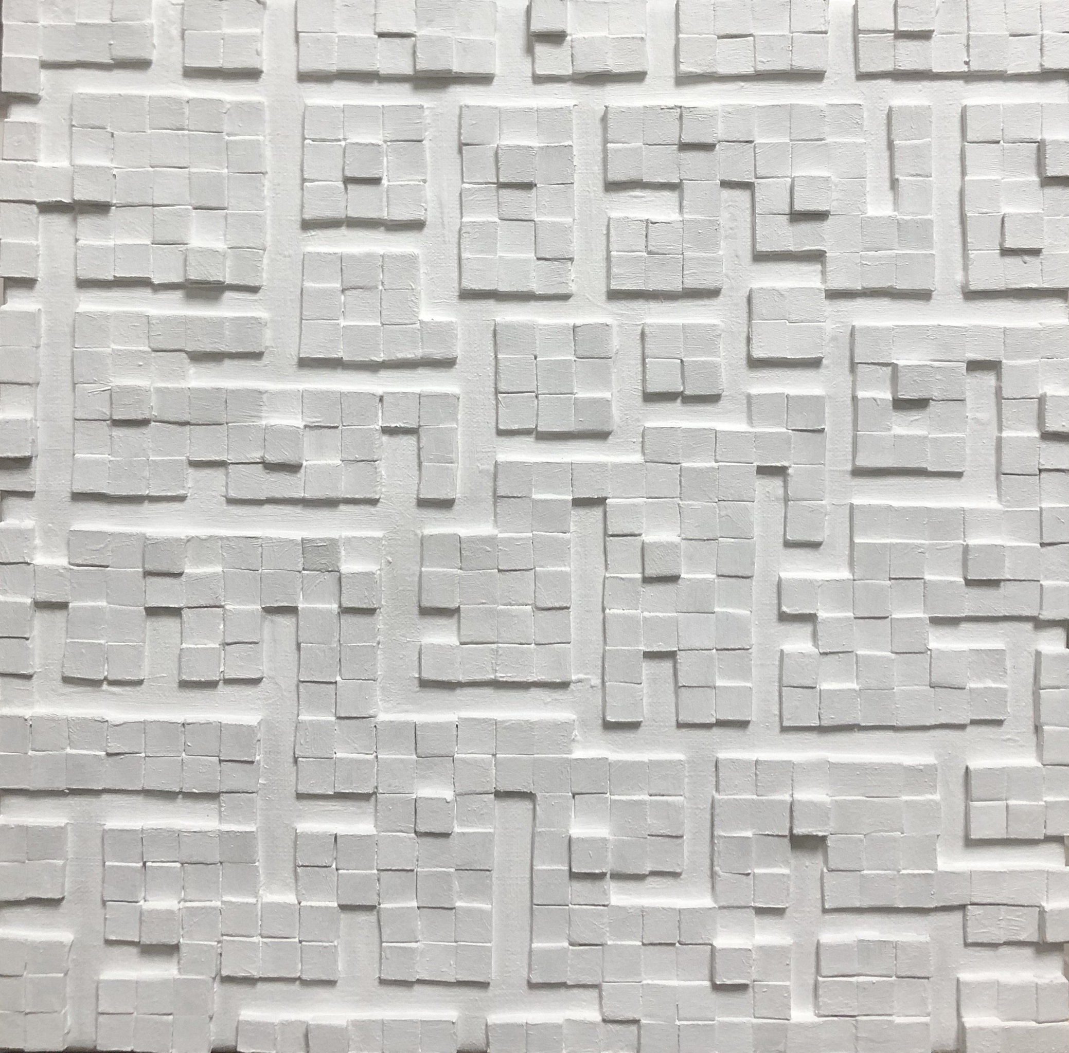 Thema: Chaos (Geometrische Chaos) Mijn kunst is beïnvloedt door de moderne wiskundige en wetenschappelijke benadering van het begrip complexe orde van de natuur. Met name heb ik me verdiept in de Chaos theorie en de fractal geometrie. Ik ben geen wiskundige, en ik gebruik geen wiskundige formules. De ideeën van de Chaos theorie en fractal geometrie leiden tot de ontwikkeling van de composities in mijn werk. Ik gebruik driehoeken,vierkanten en cirkels in mijn schilderijen, maar in mijn huidige serie, geoChao richt ik me alleen op de vierkanten en de verhoudingen tussen de vierkanten. Ik ontwikkel mijn composities door kleine vierkantjes op grote te zetten of grote op kleine te zetten. Het gaat om de onderlinge verhoudingen tussen de vierkanten. Ik laat de methode die ik kies de compositi