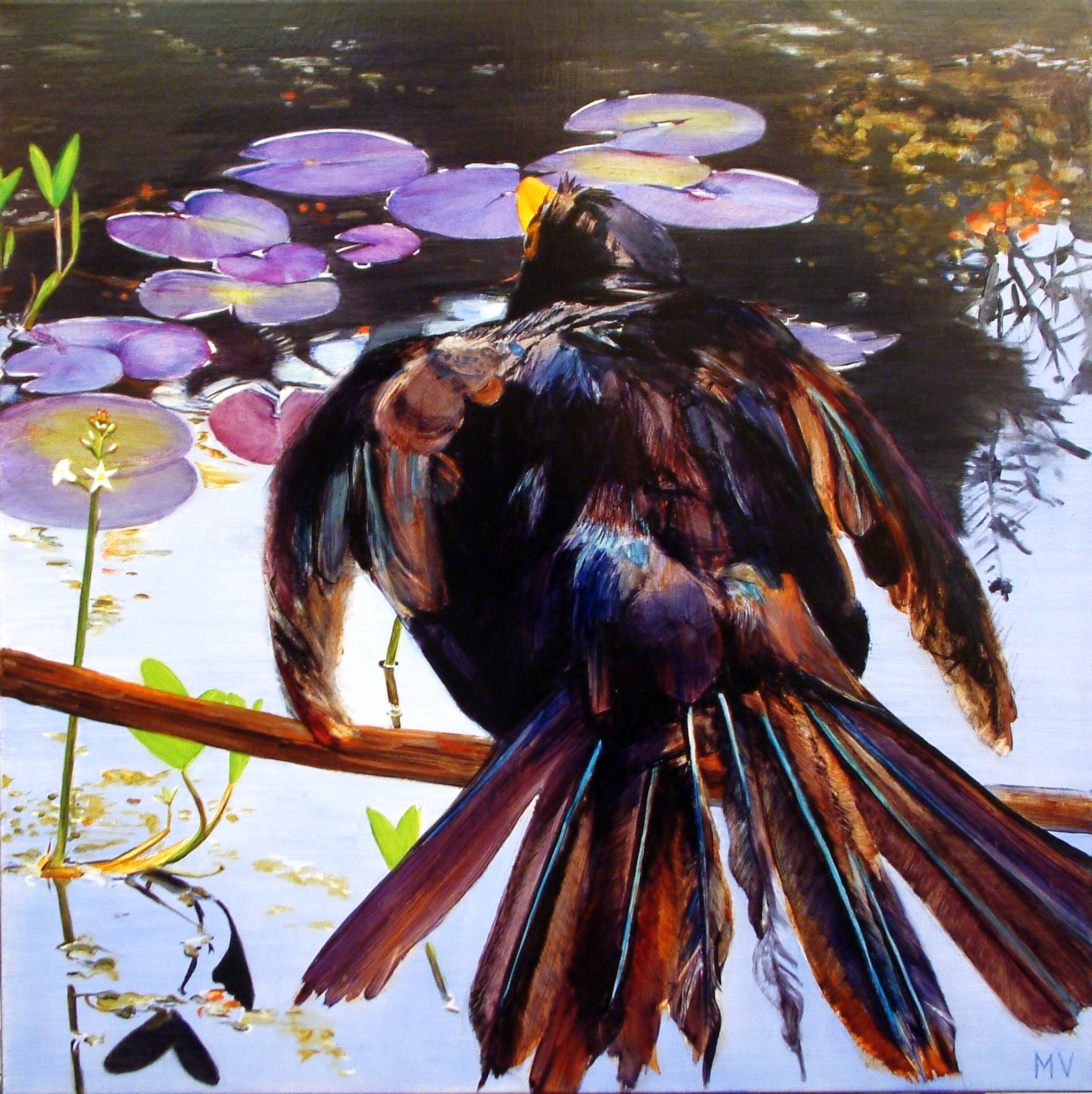 Zwart Blauw Vogel Blue Water Dier Realistisch Olieverf Oilpaint Bird Animal Realistic Merel Blackbird