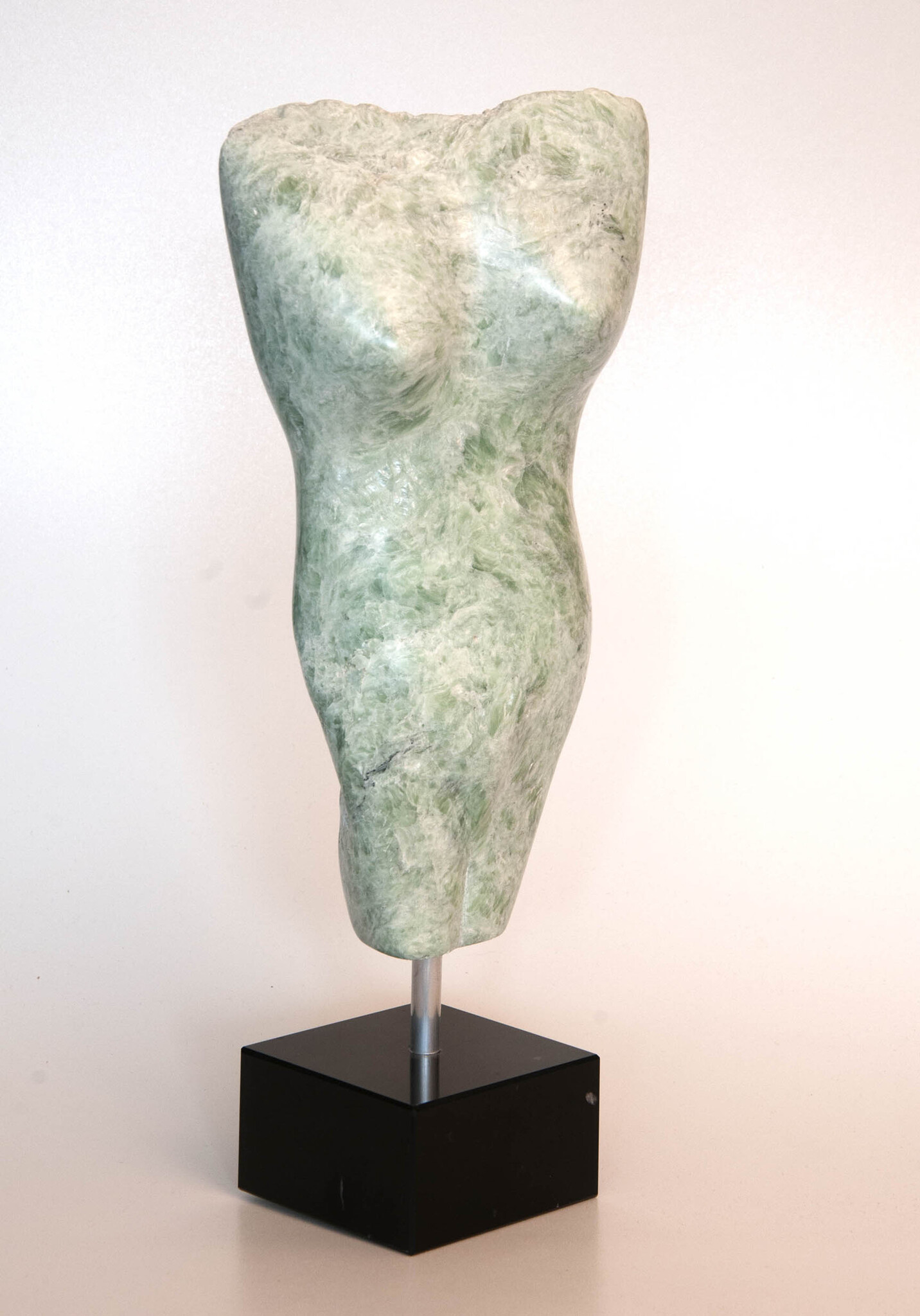 Beeld van een gestyleerd vrouwenfiguur in groen speksteen met hardstenen sokkel.