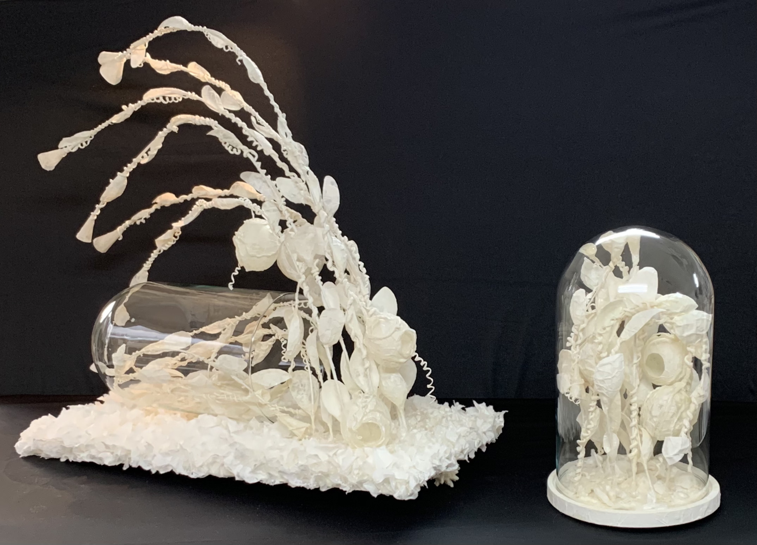 Dit werk bestaat uit 2 onderdelen: een gesloten en een open/omgevallen stolp. Een stolp als verbeelding voor het opgesloten zijn als in een lockdown, geen bewegingsvrijheid, gesloten, geen lucht, vol gegroeid met stengels, bladeren, bloemen en ranken. De cocons zijn als een soort natuurlijke baarmoeders als hoop voor de toekomst. In de 2e fase valt de stolp om en is er lucht, ruimte en vrijheid. De bloemstengels en ranken kunnen verder groeien. Er is een bodem bedekt met bloemen. In de eerste ruimtelijke stolp, vol gegroeid en gesloten met stengels, bladeren, windsels en bloemen, heb ik cocons toegevoegd. De cocons zijn als een soort natuurlijke baarmoeders als hoop voor de toekomst.