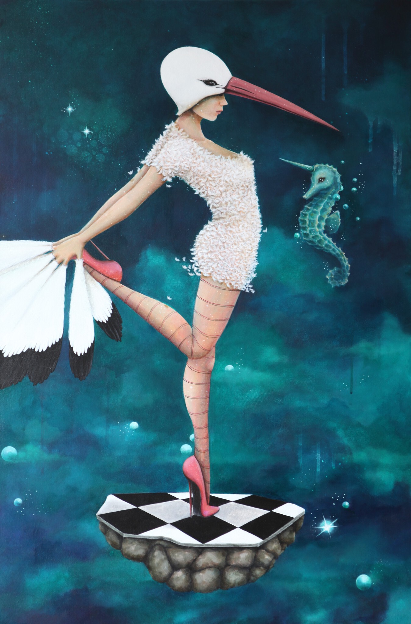 Vogel Wolken Vrouw Woman Lucht Surrealisme Clouds Bird Ooievaar Stork Sterren Fantasy Stars Zeepaard Seahorse Birdwoman Vogelvrouw Surrealsm