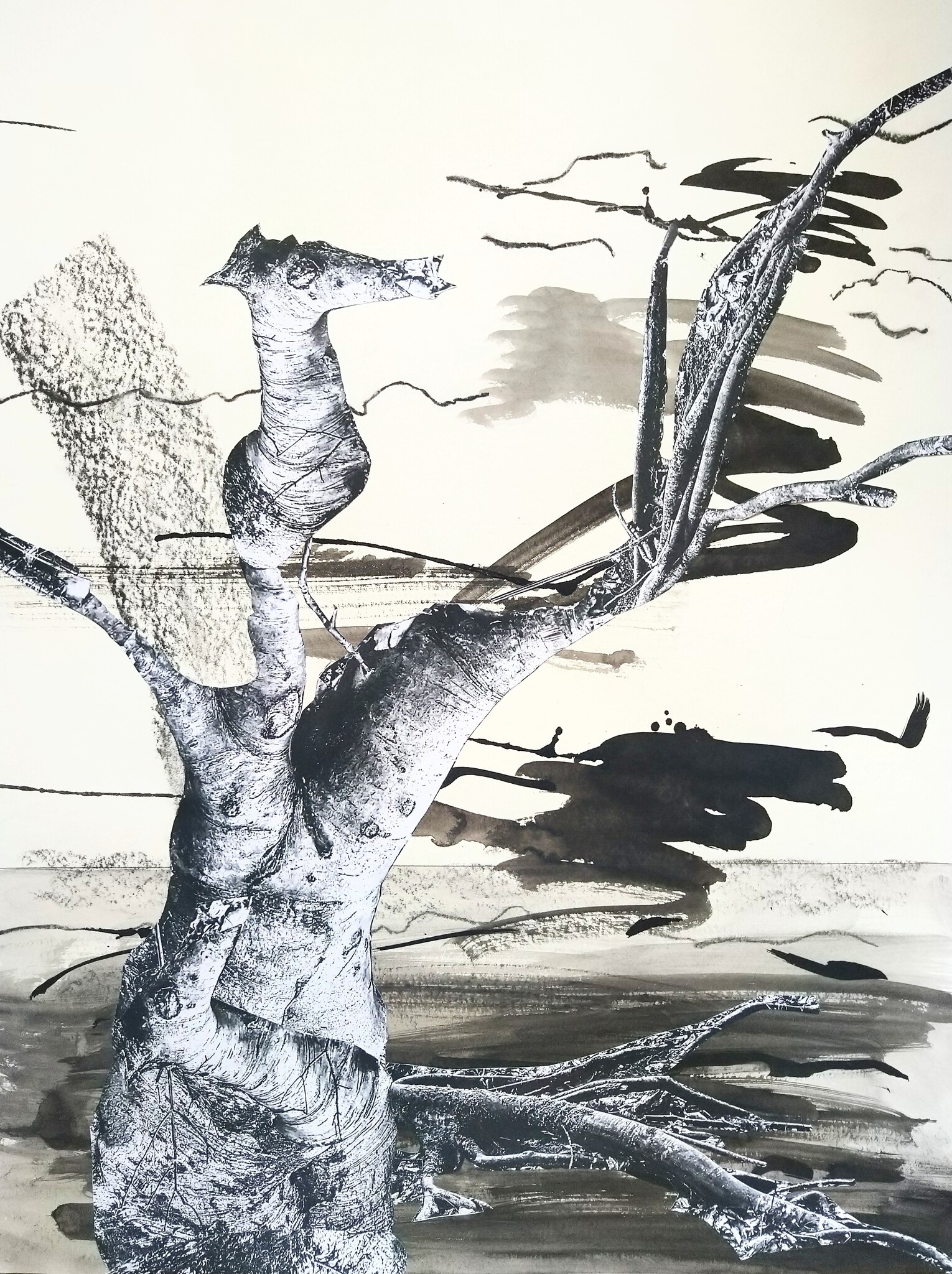 Collage van fotowerk, inkt, pen en potlood op papier. 50x65 cm Zwart Wit