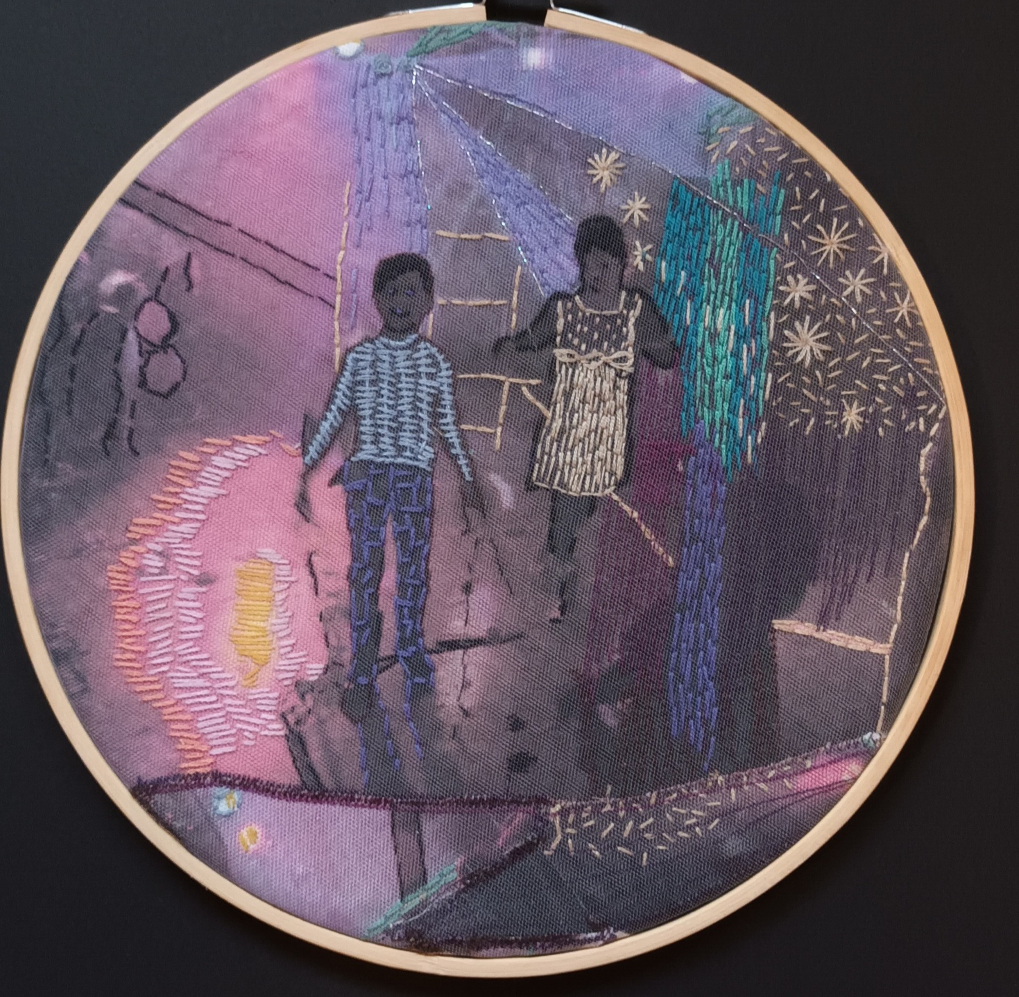 Dancing children. Printed photo on canvas. Embroided and machine work