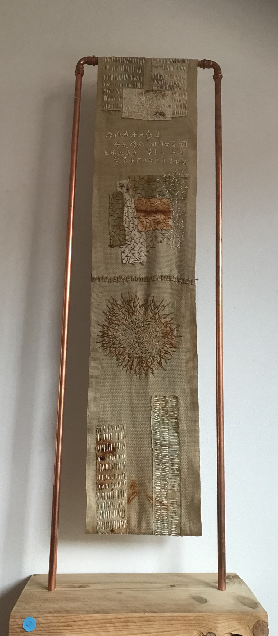 Na mijn borstkankeroperatie in 2019 was mijn creatieve brein op non actief.Het enige waar ik toe in staat was was voor de voet weg borduren. Ik had eerder al een partij handdoekrollen gekocht die in automaten hangen. Daarvan heb ik 10 meter geborduurd en die 10 meter heb ik verknipt tot 5 stukken. Daarvoor is een standaard gemaakt van koperen waterleidingbuizen waar het werk over hangt en dus net als vroeger in hun functie van handdoek kunnen rollen. Op die manier kun je steeds een ander stuk voor draaien. Het werk is aan beide zijden mooi.