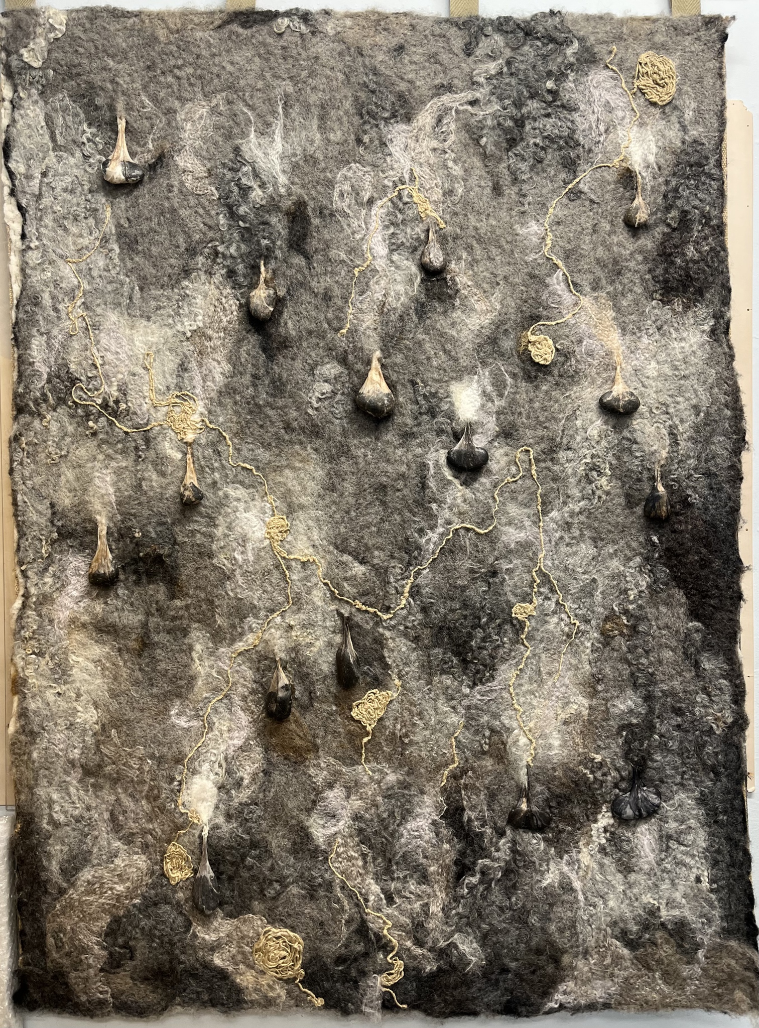 2022 Viltwerk: wol, zijde, steen, draad, harder. Wandobjekt: Constellatie, samenspel en uiteenvallen. Zwaarte en ballast.