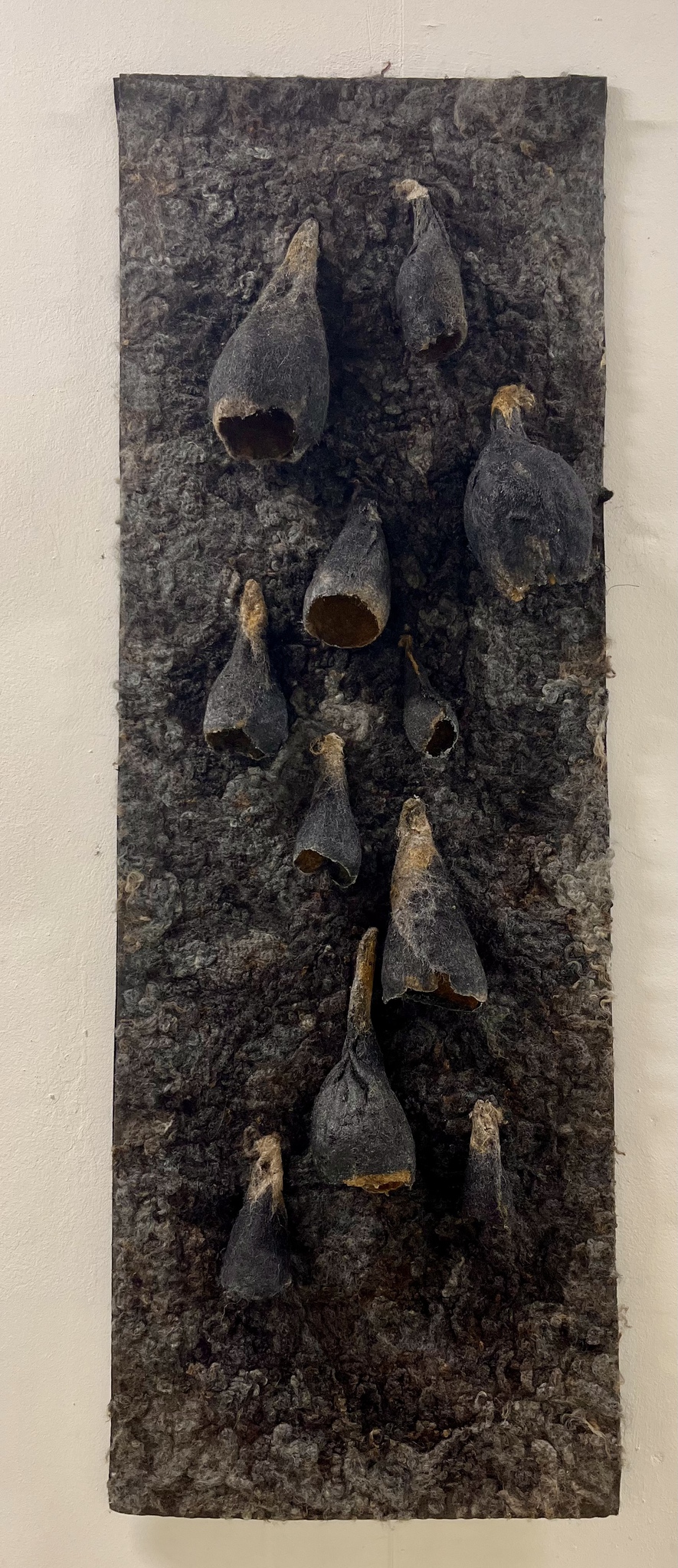 Wandobjekt: driedimensionaal, organisch. Verval. Wol, textielverharder, rubberlatex.