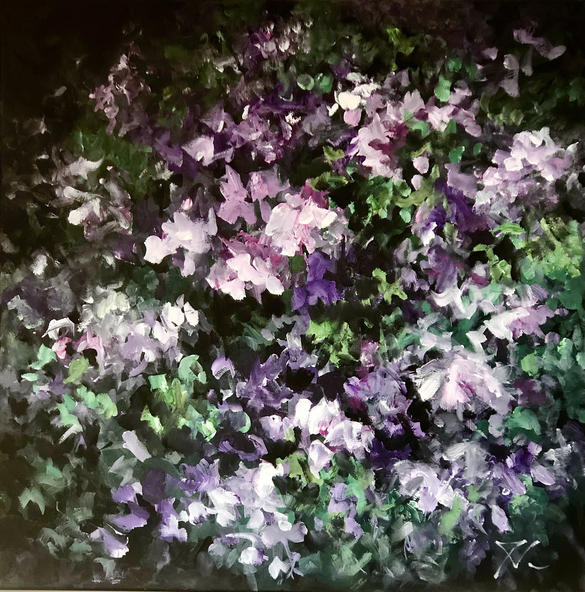 'Paars tuintje' is een abstract bloemenschilderij waarin subtiele tinten paars, lila, zacht roze en wit centraal staan, omlijst door weelderig groen. De losse toets en de textuur geven het werk een natuurlijke gelaagdheid – alsof je naar een rijk gevulde bloembak kijkt. Een contrastrijk abstract werk met diepte, dat met losse toets is geschilderd, rust uitstraalt en tegelijk sprankelt door zijn kleurcombinaties. Over het werk: gesigneerd · acryl op canvas · opgespannen op stevig houten frame · meegeschilderde zijkanten · klaar om op te hangen Bij vragen neem gerust contact met mij op →