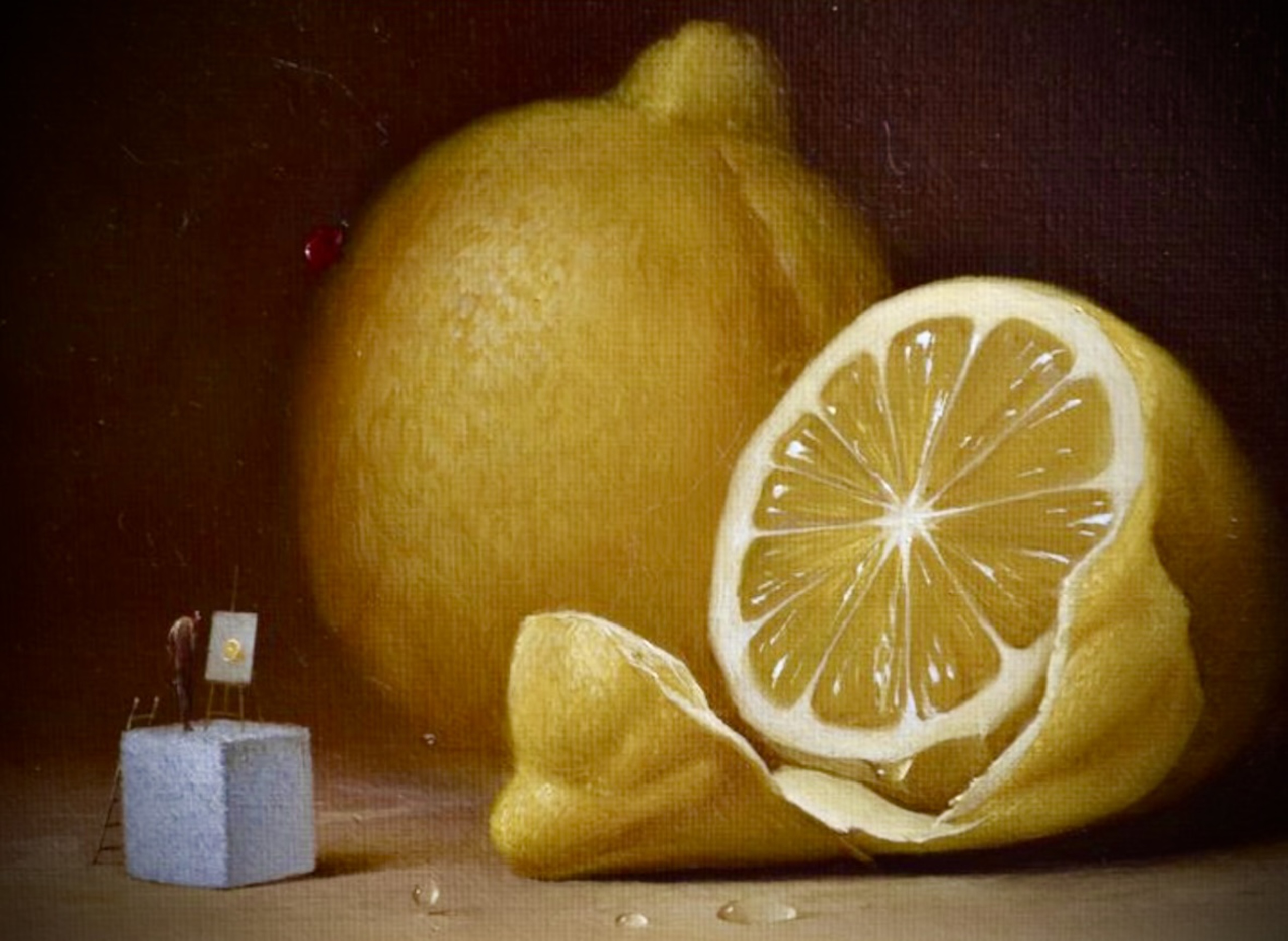 Uit de serie Mini schilderijtjes Deze citroenen worden vanaf een klein mini ezeltje beschilderd