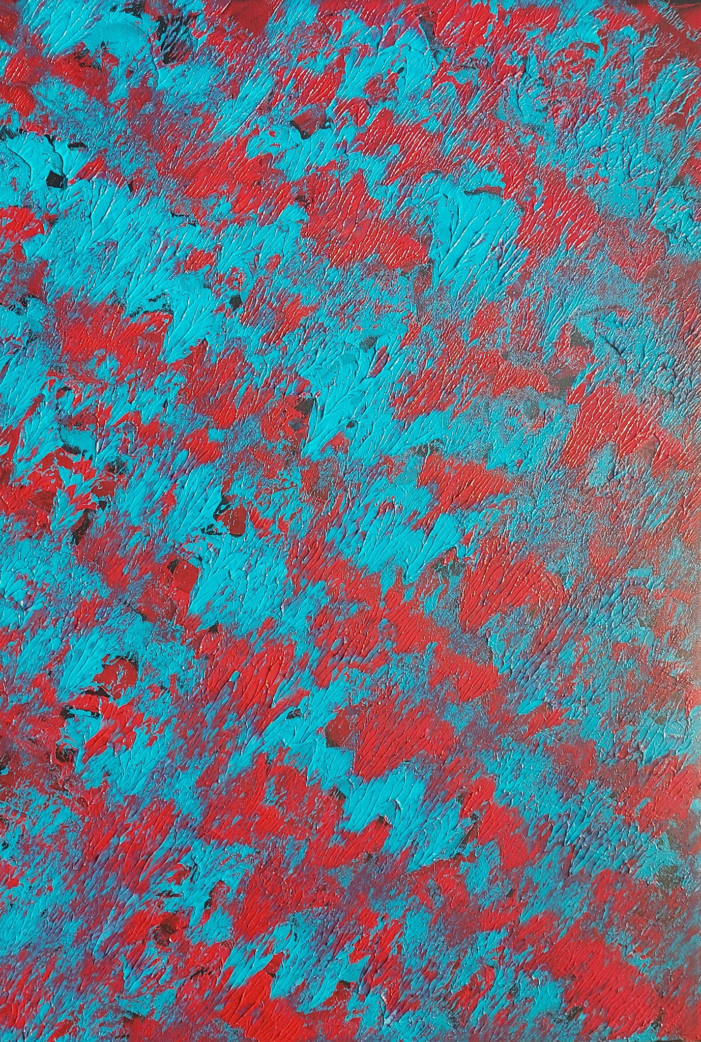 De twee acryl kleuren vloeien mooi in elkaar over terwijl er toch diepte blijft bestaan door de duidelijke structuur in de beide verven.