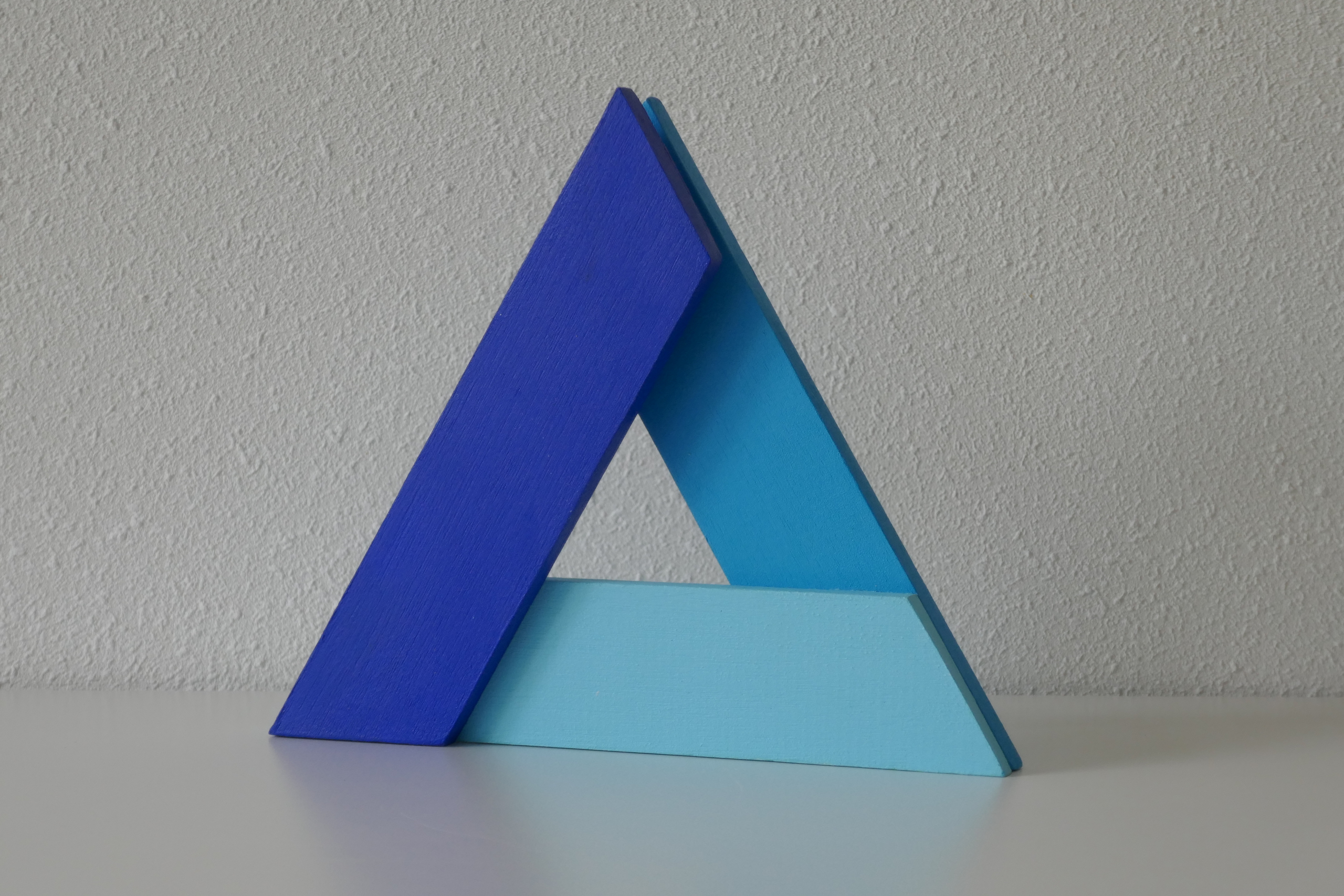 De driehoek is gevormd uit 3 kleinere delen van elk 20 cm. De dikte is 3 cm. Er zijn verschillende kleurcombinaties gemaakt.