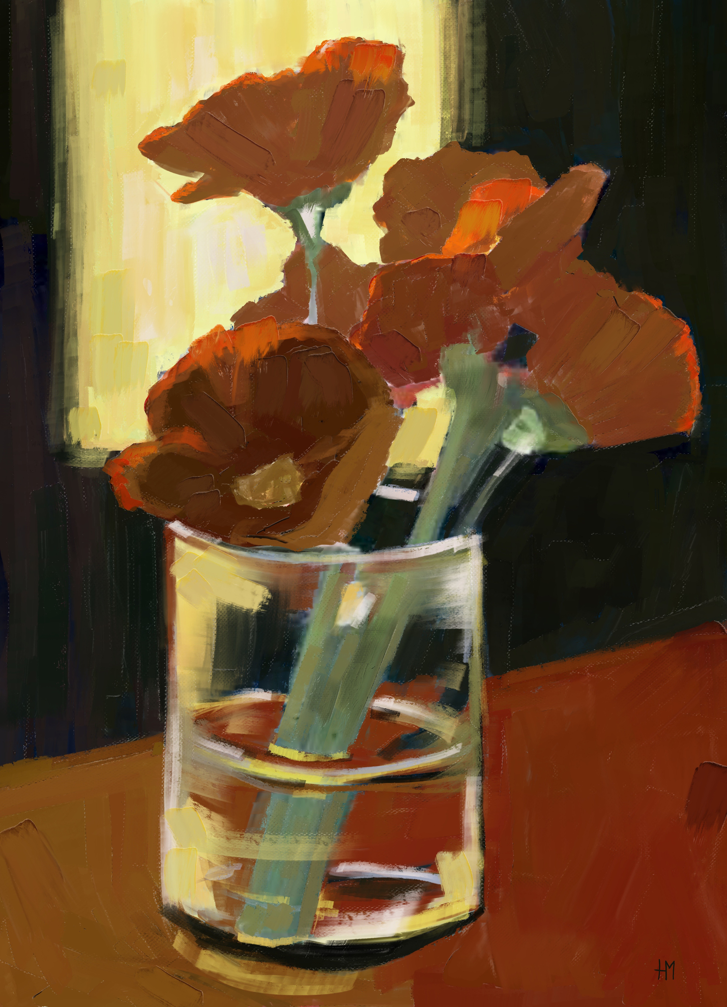 Mooi modern schilderij met veel kleur van een bloemen voor het raam. Mooie bloemen schilderij. Schilderij in rood, geel en zwart. Clair obscur van bloemen. Mooie lichtval op bloemen voor het raam. Fantasie schilderij van bloemen in rode en gele tinten. Modern schilderij bloemen. Fantasie schilderij bloemen. Licht speel een grote rol in mijn werk, ik ben altijd op zoek naar het weergeven van mooie lichtval. De onderwerpen kunnen erg uiteenlopend zijn. Ik hou van verandering en ik werk van abstract tot realistisch. Dit schilderij maakt deel uit van een serie in dezelfde kleurtinten. Van heel abstract tot realistisch. Het origineel si verkocht maar het is nog te koop als art-print op papier, dibond hout of ander materiaal.