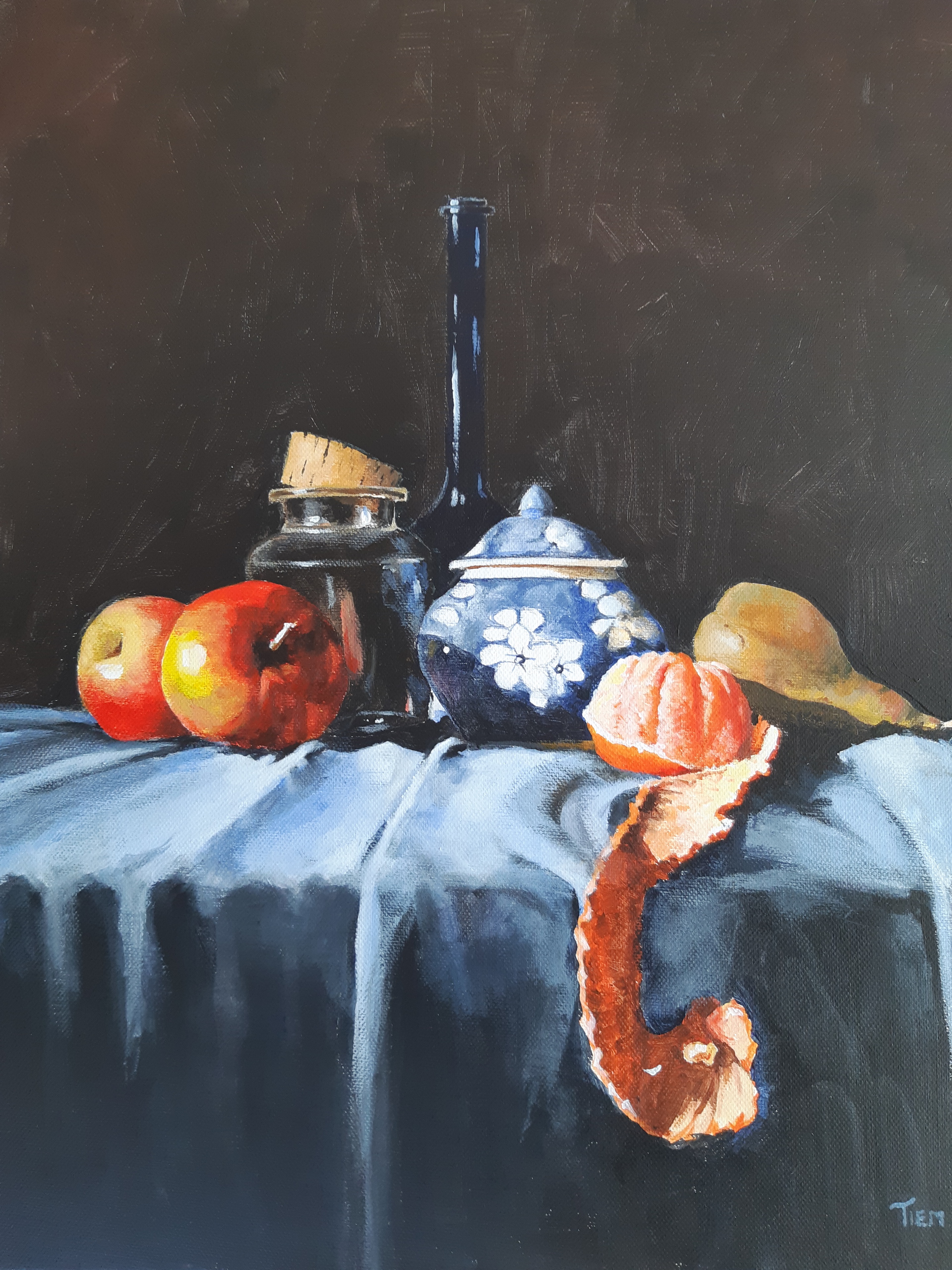stilleven met blauw potje