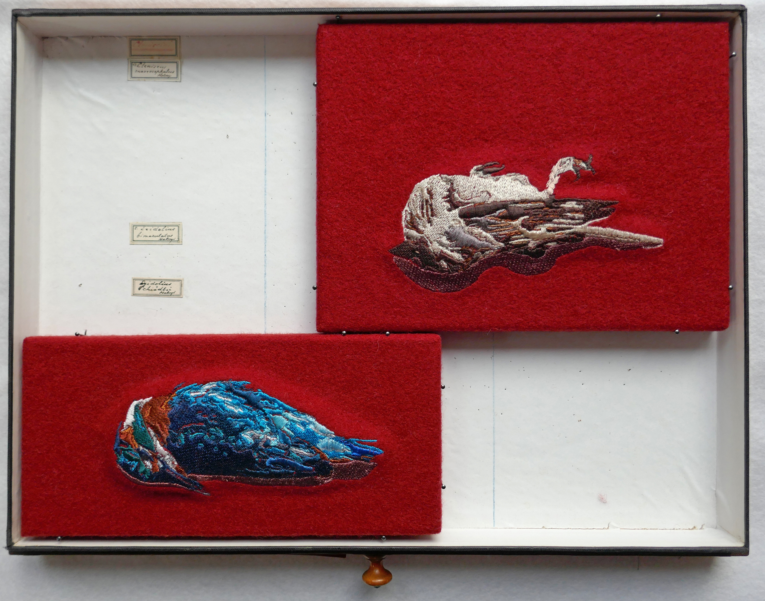 Textielwerk op hout glansgaren op 100% scheerwol (Kvadrat), oude insectendoos, borduurmachine en handmatig borduren (2015-2017) Foto zonder glazen deksel en zonder stalen onderstel.