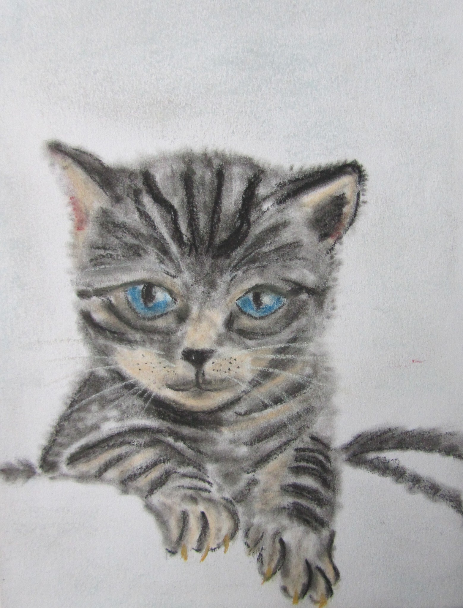 Het is het jaar 2000. Ik heb een doosje oliepastelpotloden gekocht. Dit katje is het eerste wat in het meegekochte schetsboekje staat.