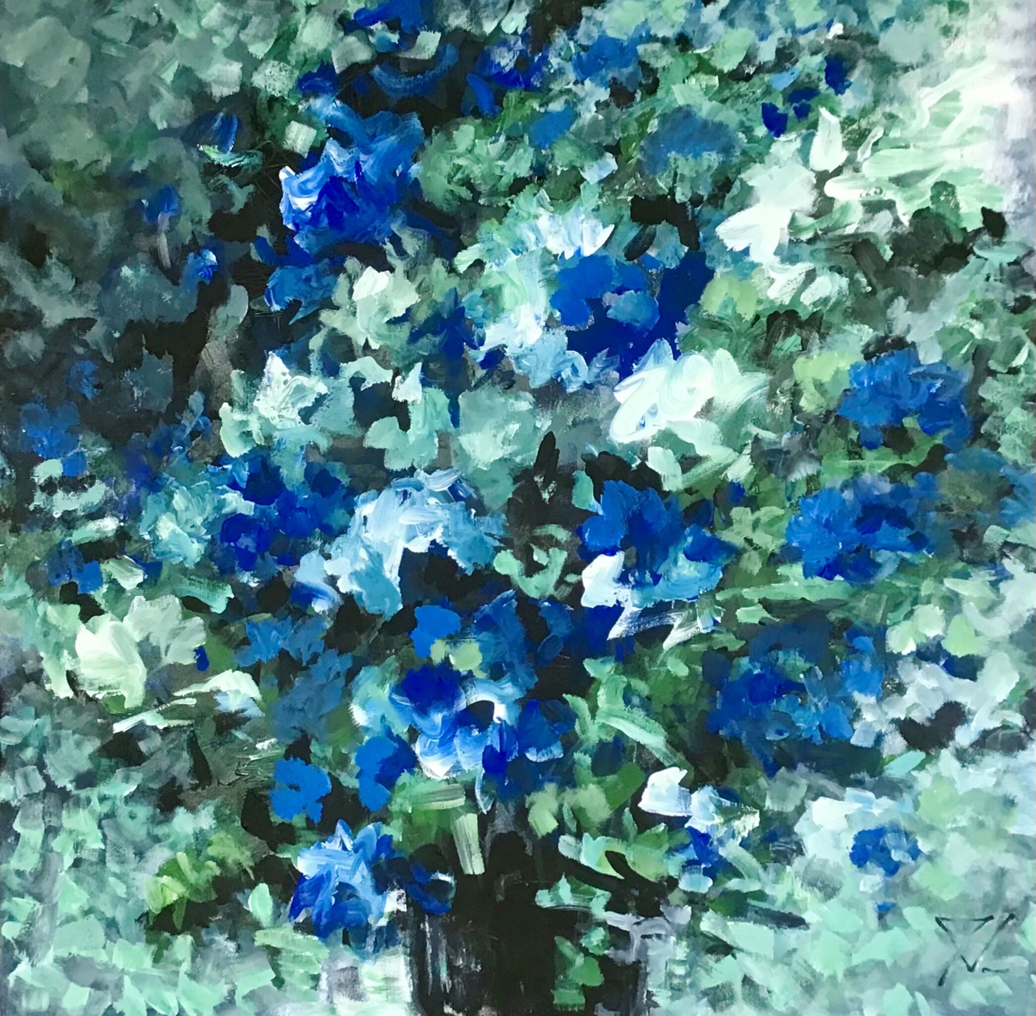 Een expressief abstract bloemenschilderij waarin blauw getinte bloei elegant contrasteert met de zwarte vaas. De compositie is krachtig en toch harmonieus, met speelse penseeltoetsen en een sterke balans tussen licht en donker. Een eigentijds kunstwerk dat sfeer geeft aan elk interieur – modern, stijlvol en een tikje mysterieus. Over het werk: gesigneerd · acryl op canvas · opgespannen op stevig houten frame · meegeschilderde zijkanten · klaar om op te hangen Bij vragen neem gerust contact met mij op →